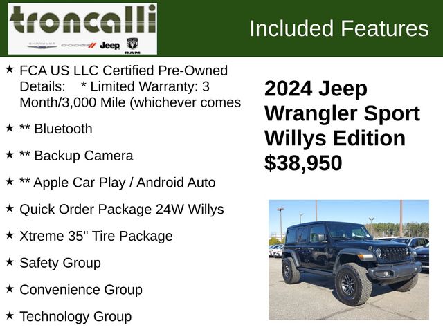 2024 Jeep Wrangler Willys Certified. CARFAX One-Owner. FCA US LLC Certified Pre-Owned Details: * Limited Warranty: 3 Month/3,000 Mile (whichever comes, ** Bluetooth, ** Backup Camera, ** Apple Car Play / Android Auto, 2-Door Passive Entry, Front Door Locks, 240 Amp Alternator, 35" Tire Suspension, 4-Wheel Disc Brakes, 4-Wheel Drive Swing Gate Decal, 4.56 Rear Axle Ratio, 7 & 4 Pin Wiring Harness, 8 Speakers, 97 MPH Vehicle Max Speed Calibration, ABS brakes, Advanced Brake Assist, Air Conditioning, Air Conditioning w/Auto Temperature Control, Air Filtering, Alpine Premium Audio System, AM/FM radio, Anti-Lock 4-Wheel Disc Perf Brakes, Apple CarPlay/Android Auto, Auto High Beam Headlamp Control, Automatic Headlamps, Aux Battery, Auxiliary Switches, Black Grille, Blind Spot & Cross Path Detection, Brake assist, Class II Receiver Hitch, Cloth Low-Back Bucket Seats, Cluster 7.0" TFT Color Display, Compass, Convenience Group, Conventional Differential Front Axle, Corning Gorilla Glass, Dana M210 Wide HD Tube Front Axle, Dana M220 Wide Rear Axle, Daytime Running Lamps LED Accents, Deep Tint Sunscreen Windows, Delay-off headlights, Driver door bin, Driver vanity mirror, Dual front impact airbags, Dual front side impact airbags, E-Locker Rear Axle, Electronic Stability Control, Emergency/Assistance Call, Enhanced Adaptive Cruise Control, Front 1-Touch Down Power Windows, Front anti-roll bar, Front Bucket Seats, Front Center Armrest w/Storage, Front fog lights, Front LED Fog Lamps, Front reading lights, Full Speed Forward Collision Warning Plus, Heated Front Seats, Heated Steering Wheel, Injection Molded Black Rear Bumper, Integrated roll-over protection, LED Premium Reflector Headlamps, LED Taillamps, Low tire pressure warning, Mold In Color Bumper w/Gloss Black, Molded in Color Rubicon Highline Flare, MOPAR All-Weather Floor Mats, MOPAR Hinge-Gate Reinforcement, Non-Lock Fuel Cap w/o Discriminator, Normal Duty Suspension, Occupant sensing airbag, Off-Road Plus Mode, Outside temperature display, Overhead airbag, ParkSense Rear Park Assist System, ParkView Rear Back-Up Camera, Passenger door bin, Passenger vanity mirror, Power Heated Mirrors, Power steering, Power Top Quarter Window Storage Bag, Premium Wrapped Steering Wheel, Quick Order Package 24W Willys, Radio data system, Radio: Uconnect 5 w/12.3" Display, Rear anti-roll bar, Rear reading lights, Rear Window Defroster, Rear Window Wiper/Washer, Remote Keyless Entry, Remote Start System, Removable Rear Quarter Windows, Safety Group, Security Alarm, Sky 1-Touch Power Top, Speed control, Speed Sensitive Power Locks, Split folding rear seat, Steering wheel mounted audio controls, Stop-Start Dual Battery System, Sun Visors w/Illuminated Vanity Mirrors, Tachometer, Technology Group, Telescoping steering wheel, Tilt steering wheel, Traction control, Trip computer, Universal Garage Door Opener, Variably intermittent wipers, Wheel Flare Extensions, Wheels: 17" x 8" Machined w/Black Pockets, Willy's Suspension, Willys, Willys Hood Decal, Xtreme 35" Tire Package.