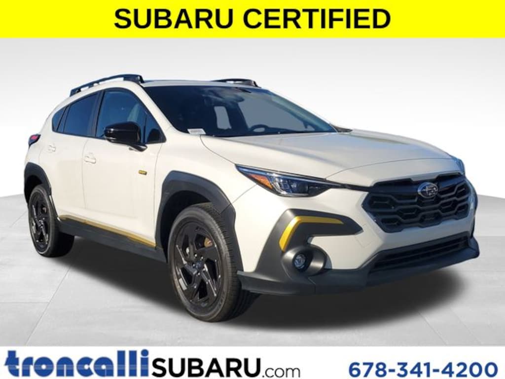 2025 Subaru Crosstrek Sport Certified. CARFAX One-Owner. ** Bluetooth, ** Backup Camera, ** Apple Car Play / Android Auto, 10-Way Power Driver's Seat, 4-Wheel Disc Brakes, 6 Speakers, ABS brakes, Air Conditioning, All-Weather Floor Liners, Alloy wheels, AM/FM radio: SiriusXM, Auto High-beam Headlights, Auto-Dimming Mirror w/Compass & HomeLink, Automatic temperature control, Blind Spot Detection (BSD), Brake assist, BSD/RCTA & Power Driver Seat & Power Moonroof, Bumpers: body-color, Driver door bin, Driver vanity mirror, Dual front impact airbags, Dual front side impact airbags, Electronic Stability Control, Exterior Parking Camera Rear, Four wheel independent suspension, Front Bucket Seats, Front Center Armrest, Front dual zone A/C, Front fog lights, Front reading lights, Fully automatic headlights, Heated door mirrors, Heated Front Bucket Seats, Heated front seats, Illuminated entry, Knee airbag, Leather Shift Knob, Leather steering wheel, Low tire pressure warning, Occupant sensing airbag, Outside temperature display, Overhead airbag, Overhead console, Panic alarm, Passenger door bin, Passenger vanity mirror, Power door mirrors, Power Moonroof, Power steering, Power windows, Radio data system, Rear Bumper Cover, Rear Cross-Traffic Alert (RCTA) System, Rear seat center armrest, Rear Seatback Protector, Rear window defroster, Rear window wiper, Remote keyless entry, Security system, Speed control, Speed-sensing steering, Split folding rear seat, Spoiler, Sport Cloth Upholstery, Steering wheel mounted audio controls, Tachometer, Telescoping steering wheel, Tilt steering wheel, Traction control, Trip computer, Turn signal indicator mirrors, Variably intermittent wipers, Wheels: 18" x 7.0" J Dark Gray Aluminum-Alloy.