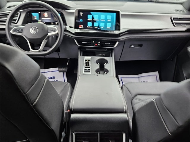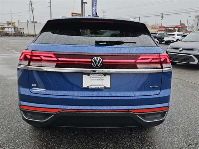 Mountain Lake Blue Metallic 2025 Volkswagen Atlas Cross Sport 2.0T SE AWD 8-Speed Automatic with Tiptronic 2.0L TSI This Atlas Cross Sport is equipped with. 4-Wheel Disc Brakes, 4-Wheel Independent Suspension, 6 Speakers, ABS brakes, Air Conditioning, Alloy wheels, AM/FM radio: SiriusXM with 360L, Auto High-beam Headlights, Auto-dimming Rear-View mirror, Automatic temperature control, Brake assist, Bumpers: body-color, Compass, Delay-off headlights, Driver door bin, Driver vanity mirror, Dual front impact airbags, Dual front side impact airbags, Electronic Stability Control, Emergency communication system: VW Car-Net Safe & Secure 5-year, Exterior Parking Camera Rear, Four wheel independent suspension, Front anti-roll bar, Front Bucket Seats, Front Center Armrest, Front dual zone A/C, Front fog lights, Front reading lights, Fully automatic headlights, Heated & Actively Ventilated Front Seats, Heated door mirrors, Heated front seats, Heated steering wheel, Illuminated entry, Low tire pressure warning, Occupant sensing airbag, Outside temperature display, Overhead airbag, Overhead console, Panic alarm, Passenger door bin, Passenger vanity mirror, Perforated V-Tex Leatherette Seating Surfaces, Power door mirrors, Power driver seat, Power steering, Power windows, Radio data system, Radio: MIB3 Composition Media AM/FM/HD, Rain sensing wipers, Rear anti-roll bar, Rear reading lights, Rear seat center armrest, Rear window defroster, Rear window wiper, Remote keyless entry, Security system, Speed control, Speed-sensing steering, Split folding rear seat, Spoiler, Steering wheel mounted audio controls, Tachometer, Telescoping steering wheel, Tilt steering wheel, Traction control, Trip computer, Turn signal indicator mirrors, Variably intermittent wipers, Ventilated front seats, Wheels: 18" 5-Spoke 2-Tone Machined Alloy.
