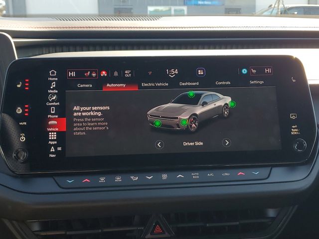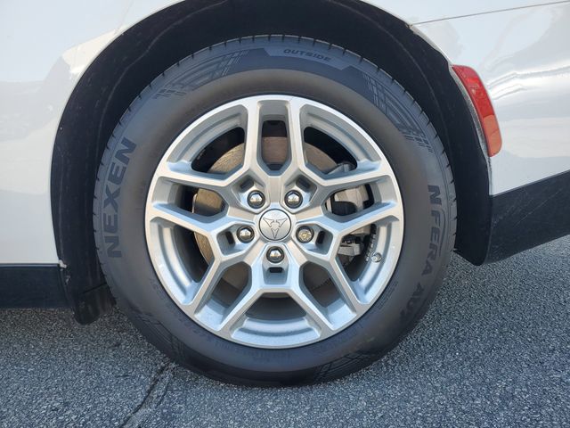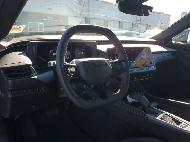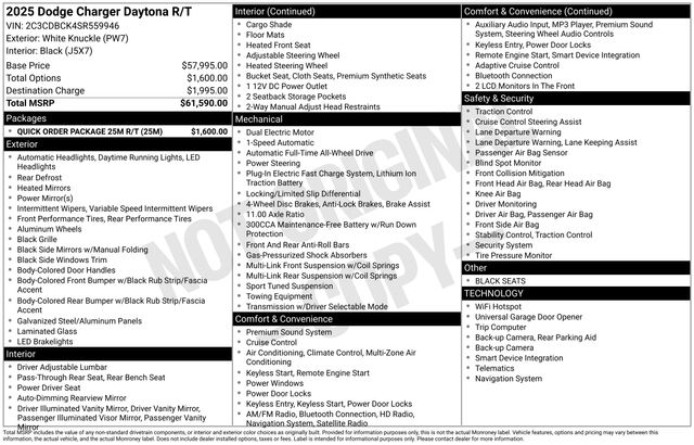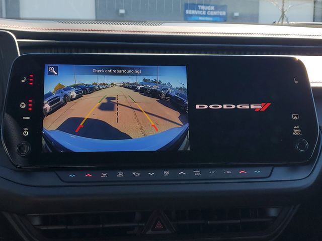 Included features are Quick Order Package 25M R/T, Two Tone Paint Group, AWD, Black Cloth, 10 Speakers, 18" x 8.5" Aluminum Wheels, 2-Way Manual Adjust Head Restraints, 2-Way Power Driver Lumbar Adjust, 4-Wheel Disc Brakes, 8-Way Power Driver Seat Adjust, ABS brakes, Air Conditioning, Alloy wheels, AM/FM radio: SiriusXM w/360L, Apple CarPlay/Android Auto, Auto-dimming Rear-View mirror, Automatic temperature control, Black Seats, Brake assist, Bumpers: body-color, Compass, Delay-off headlights, Driver door bin, Driver vanity mirror, Dual front impact airbags, Dual front side impact airbags, Electronic Stability Control, Emergency communication system: Dodge Connect, Four wheel independent suspension, Front anti-roll bar, Front Bucket Seats, Front Center Armrest, Front dual zone A/C, Front reading lights, Fully automatic headlights, Garage door transmitter, Heated door mirrors, Heated Exterior Mirrors, Heated Front Seats, Heated front seats, Heated steering wheel, Illuminated entry, Knee airbag, Leather Shift Knob, Leatherette/Cloth Performance Seats, Low Back Bucket Seats, Low tire pressure warning, Navigation System, Nexen Brand Tires, Occupant sensing airbag, Outside temperature display, Overhead airbag, Overhead console, Panic alarm, ParkView Rear Back-Up Camera, Passenger door bin, Passenger vanity mirror, Power Adjust Mirrors, Power door mirrors, Power driver seat, Power steering, Power windows, Radio data system, Radio: Uconnect 5 Nav w/12.3" Display, Rear anti-roll bar, Rear reading lights, Rear seat center armrest, Rear window defroster, Remote keyless entry, Security system, Speed control, Split folding rear seat, Sport steering wheel, Steering wheel mounted audio controls, Telescoping steering wheel, Tilt steering wheel, Traction control, Trip computer, and Variably intermittent wipers. AWD, Black Cloth. Price includes the following rebates:$500 - 2025 National 2025 Military Bonus Cash. Exp. 01/04/2027 $7750 - 2025 National EV Credit Select Inventory Retail Bonus Cash. Exp. 04/30/2026