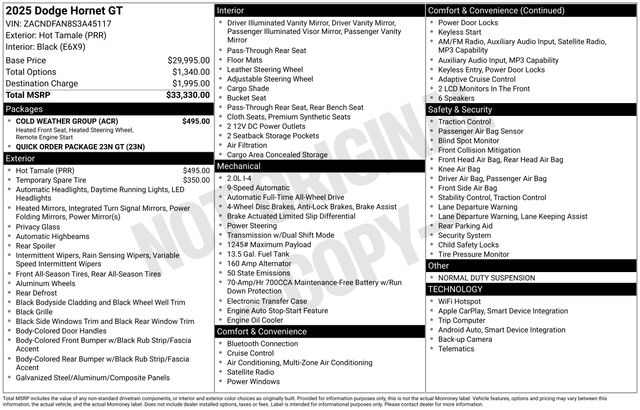 Hot Tamale 2025 Dodge Hornet GT GT AWD Price includes the following rebates:$1500 - 2025 National Retail Bonus Cash . Exp. 03/31/2026 $500 - 2025 National 2025 Military Bonus Cash. Exp. 01/04/2027