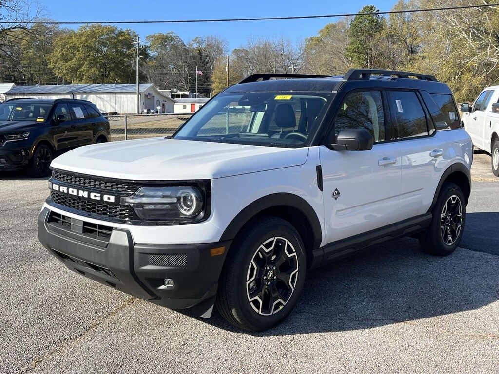 This 2025 Ford Bronco Sport Outer Banks in Oxford White is equipped with 4WD 8-Speed Automatic 1.5L EcoBoost ** Apple Car Play / Android Auto, ** Leather, Heated front seats, Wheels: 18" Ebony Black-Painted Aluminum.