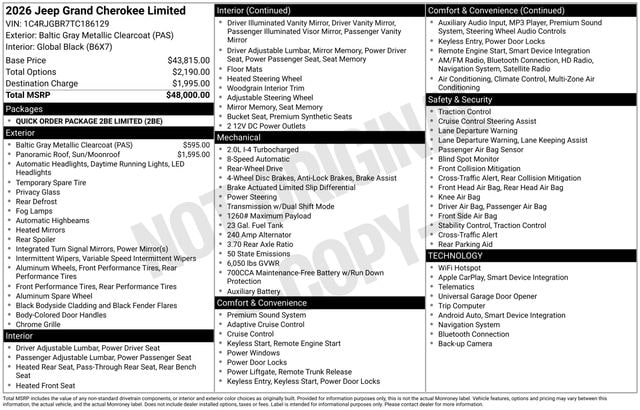Included features are Quick Order Package 2BE Limited, 10 Speakers, 3.70 Rear Axle Ratio, 4-Wheel Disc Brakes, 4G LTE Wi-Fi Hot Spot, ABS brakes, Active Noise Control System, Air Conditioning, Alloy wheels, AM/FM radio: SiriusXM with 360L, Anti-whiplash front head restraints, Apple CarPlay, AppLink/Apple CarPlay and Android Auto, Audio memory, Auto High-beam Headlights, Automatic temperature control, Auxiliary Battery, Brake assist, Bumpers: body-color, Capri Leatherette Seats, Compass, Connectivity - US/Canada, Delay-off headlights, Disassociated Touchscreen Display, Driver door bin, Driver vanity mirror, Dual front impact airbags, Dual front side impact airbags, Dual-Pane Panoramic Sunroof, Electronic Stability Control, Emergency communication system, For Details, Visit DriveUconnect.com, Four wheel independent suspension, Front anti-roll bar, Front Bucket Seats, Front Center Armrest w/Storage, Front dual zone A/C, Front fog lights, Front reading lights, Fully automatic headlights, Garage door transmitter, Global Telematics Box Module (TBM), Gloss Black Exterior Mirrors, Google Android Auto, GPS Antenna Input, Heated door mirrors, Heated Exterior Mirrors, Heated front seats, Heated rear seats, Heated steering wheel, Illuminated entry, Integrated Center Stack Radio, Integrated Voice Command with Bluetooth, Knee airbag, Low tire pressure warning, Manual Folding Exterior Mirrors, Memory seat, Navigation System, Normal Duty Suspension, Occupant sensing airbag, Outside temperature display, Overhead airbag, Overhead console, Panic alarm, ParkView Rear Back-Up Camera, Passenger door bin, Passenger vanity mirror, Power door mirrors, Power driver seat, Power Liftgate, Power passenger seat, Power steering, Power windows, Radio data system, Radio: Uconnect 5 Nav with 12.3" Display, Rear anti-roll bar, Rear reading lights, Rear window defroster, Rear window wiper, Remote keyless entry, Security system, Speed control, Speed-Sensitive Wipers, Split folding rear seat, Spoiler, Steering wheel mounted audio controls, Tachometer, Telescoping steering wheel, Tilt steering wheel, Traction control, Trip computer, Turn signal indicator mirrors, USB Host Flip, Variably intermittent wipers, Voltmeter, Wheels: 18" x 8.0" Polished/Painted Aluminum, and Wheels: 20" x 8.5" Machined/Painted AluminuM. Price includes the following rebates:$1000 - 2026 National Stellantis Loyalty Bonus Cash . Exp. 04/30/2026 $1500 - 2026 National Retail Bonus Cash . Exp. 04/30/2026 $2000 - 2026 National SFS Lease Loyalty Bonus Cash . Exp. 04/30/2026 $500 - 2026 National 2026 Military Bonus Cash . Exp. 01/04/2027