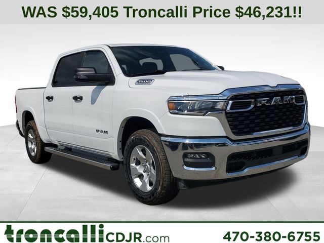 Included features are Big Horn Level 1 Equipment Group (115V Auxiliary Power Outlet, 2nd Row in Floor Storage Bins, 3 Rear Seat Head Restraints, 4 Way Front Headrests, 400W Inverter, Auto Power-Folding Mirrors, Auto-Dimming Exterior Driver Mirror, Auto-Dimming Rear-View Mirror, Black Exterior Mirrors, Black Premium Power Mirrors, Body Color Fender Flares, Bucket Seats, Center Console Parts Module, Convex Wide-Angle Exterior Mirror Insert, Deluxe Cloth Bucket Seats, Exterior Mirrors Courtesy Lamps, Exterior Mirrors with Heating Element, Exterior Mirrors with Supplemental Signals, Front Seat Back Map Pockets, Full Length Floor Console, Glove Box Lamp, Heated Front Seats, Heated Steering Wheel, Leather Wrapped Steering Wheel, Manual Adjust 4-Way Front Passenger Seat, Power 2-Way Driver Lumbar Adjust, Power Adjust 8-Way Driver Seat, Power Adjustable Pedals, Rear 60/40 Folding Seat, Rear Center Armrest, Rear Dome with on/Off Switch Lamp, Rear Power Sliding Window, Rear Window Defroster, SiriusXM Radio Service, SiriusXM Satellite Radio, Steering Wheel Mounted Audio Controls, Sun Visors with Illuminated Vanity Mirrors, and Universal Garage Door Opener), Quick Order Package 21Z Big Horn, Quick Order Package 23Z Big Horn, 4-Wheel Disc Brakes, 48V Belt Starter Generator, 4G LTE Wi-Fi Hot Spot, 6 Speakers, ABS brakes, Air Conditioning, Alloy wheels, AM/FM radio, Apple CarPlay, Apple CarPlay/Android Auto, Auto High-beam Headlights, Brake assist, Bumpers: chrome, Cloth Bucket Seats, Compass, Connectivity - US/Canada, Delay-off headlights, Driver door bin, Dual front impact airbags, Dual front side impact airbags, Electronic Stability Control, Front anti-roll bar, Front Bucket Seats, Front Center Armrest w/Storage, Front fog lights, Front reading lights, Front wheel independent suspension, Fully automatic headlights, Global Telematics Box Module, Google Android Auto, GPS Antenna Input, Heated door mirrors, Illuminated entry, Integrated Center Stack Radio, Integrated Voice Command with Bluetooth, Low tire pressure warning, Manual Adjust 4-Way Driver Seat, Manual Folding Exterior Mirrors, MOPAR Front and Rear Rubber Floor Mats, MyFlexCare Service Plan, Occupant sensing airbag, Outside temperature display, Overhead airbag, Overhead console, Panic alarm, ParkView Rear Back-Up Camera, Passenger door bin, Passenger vanity mirror, Power door mirrors, Power steering, Power windows, Radio data system, Radio: Uconnect 5 W with 8.4" Display, RAM Grille Badge - Chrome, Rear anti-roll bar, Rear step bumper, Rear Wheelhouse Liners, Remote keyless entry, Speed control, Supplier Part Tracking (J-1), Tachometer, Telescoping steering wheel, Tilt steering wheel, Traction control, Trip computer, USB Host Flip, Variably intermittent wipers, Voltmeter, and Wheels: 18" x 8" Cast-Aluminum Painted. Price includes the following rebates:$1000 - 2026 Southeast BC Retail Bonus Cash. Exp. 04/30/2026 $2000 - 2026 National SFS Lease Loyalty Bonus Cash . Exp. 04/30/2026 $3500 - 2026 National Retail Bonus Cash . Exp. 04/30/2026 $500 - 2026 National 2026 Military Bonus Cash . Exp. 01/04/2027 $500 - 2026 Southeast BC Retail Bonus Cash. Exp. 04/30/2026