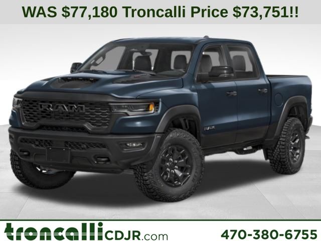 Included features are Quick Order Package 22Y RHO, 10 Speakers, 3.92 Rear Axle Ratio, 4-Wheel Disc Brakes, 4G LTE Wi-Fi Hot Spot, ABS brakes, Adaptive suspension, Adjustable pedals, Air Conditioning, Alloy wheels, AM/FM radio, Apple CarPlay/Android Auto, Auto High-beam Headlights, Auto Power-Folding Mirrors, Auto-dimming door mirrors, Auto-Dimming Exterior Driver Mirror, Auto-dimming Rear-View mirror, Automatic temperature control, Brake assist, Compass, Connected Travel and Traffic Services, Connectivity - US/Canada, Delay-off headlights, Disassociated Touchscreen Display, Driver door bin, Driver vanity mirror, Dual front impact airbags, Dual front side impact airbags, Electronic Stability Control, Exterior Mirrors Courtesy Lamps, Exterior Mirrors with Heating Element, Exterior Mirrors with Supplemental Signals, Exterior Parking Camera Rear, Flareside Box, Front anti-roll bar, Front Bucket Seats, Front Center Armrest w/Storage, Front dual zone A/C, Front fog lights, Front License Plate Bracket, Front reading lights, Front wheel independent suspension, Fully automatic headlights, Garage door transmitter, GPS Navigation, HD Radio, Heated door mirrors, Heated front seats, Heated steering wheel, Illuminated entry, Integrated Center Stack Radio, Integrated Voice Command with Bluetooth, Leather Shift Knob, Leather steering wheel, Leather Trimmed Bucket Seats, Low tire pressure warning, MOPAR RHO Exterior Graphics, Navigation System, Occupant sensing airbag, Outside temperature display, Overhead airbag, Overhead console, Panic alarm, Passenger door bin, Passenger vanity mirror, Power door mirrors, Power driver seat, Power passenger seat, Power steering, Power windows, Radio data system, Radio: Uconnect 5 Navigation with 12.0" Display, Rear reading lights, Rear seat center armrest, Rear step bumper, Rear window defroster, Remote keyless entry, Security system, SiriusXM Radio Service, Speed control, Split folding rear seat, Sport steering wheel, Steering wheel mounted audio controls, Tachometer, Telescoping steering wheel, Tilt steering wheel, Traction control, Trip computer, Turn signal indicator mirrors, USB Host Flip, Variably intermittent wipers, Voltmeter, and Wheels: 18" x 9" Black Paint/Polish Aluminum. Price includes the following rebates:$500 - 2026 National 2026 Military Bonus Cash . Exp. 01/04/2027