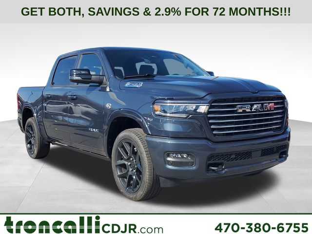 Included features are Laramie Level 1 Equipment Group (Rain Sensitive Windshield Wipers and Remote Tailgate Release), Laramie Preferred Package (Accent Color Premium Power Mirrors, Auto Power-Folding Mirrors, Auto-Dimming Exterior Driver Mirror, Black Painted Exterior Mirrors Caps, Body Color Front Bumper, Body Color Rear Bumper with Step Pads, Convex Wide-Angle Exterior Mirror Insert, Dome Dual LED Reading Lamp, Dual-Pane Panoramic Sunroof, Exterior Mirrors Courtesy Lamps, Exterior Mirrors with Heating Element, Exterior Mirrors with Memory, Exterior Mirrors with Supplemental Signals, Grille Surround 3 Body Color Tex 4 Chrome, LED Dome/Reading Lamp, Power Deployable Running Boards, RAM Grille Badge - Chrome, Tow Hooks, and Trailer Brake Control), Quick Order Package 27H Laramie, 10 Speakers, 4-Wheel Disc Brakes, 4G LTE Wi-Fi Hot Spot, ABS brakes, Active Noise Control System, Adjustable pedals, Air Conditioning, Alloy wheels, AM/FM radio: SiriusXM with 360L, Anti-Spin Differential Rear Axle, Apple CarPlay/Android Auto, Audio memory, Auto High-beam Headlights, Auto-dimming door mirrors, Auto-dimming Rear-View mirror, Automatic temperature control, Brake assist, Bumpers: chrome, Chrome Exterior Mirrors, Compass, Connected Travel and Traffic Services, Connectivity - US/Canada, Delay-off headlights, Driver door bin, Driver vanity mirror, Dual front impact airbags, Dual front side impact airbags, Electronic Stability Control, Front anti-roll bar, Front Bucket Seats, Front Center Armrest w/Storage, Front dual zone A/C, Front fog lights, Front reading lights, Front wheel independent suspension, Fully automatic headlights, Garage door transmitter, GPS Navigation, Heated door mirrors, Heated front seats, Heated rear seats, Heated steering wheel, Illuminated entry, Integrated Center Stack Radio, Integrated Voice Command with Bluetooth, Leather steering wheel, Leather Trimmed Bucket Seats, Low tire pressure warning, Memory seat, Navigation System, Occupant sensing airbag, Off-Road Information Pages, Outside temperature display, Overhead airbag, Overhead console, Panic alarm, ParkView Rear Back-Up Camera, Passenger door bin, Passenger vanity mirror, Pedal memory, Pirelli Brand Tires, Power door mirrors, Power driver seat, Power passenger seat, Power steering, Power windows, Radio data system, Radio: Uconnect 5 Navigation with 12.0" Display, Rear anti-roll bar, Rear reading lights, Rear seat center armrest, Rear step bumper, Remote keyless entry, Security system, SiriusXM Radio Service, SiriusXM with 360L, Speed control, Split folding rear seat, Steering wheel mounted audio controls, Tachometer, Telescoping steering wheel, Tilt steering wheel, Traction control, Trip computer, Turn signal indicator mirrors, USB Host Flip, Variably intermittent wipers, Ventilated front seats, Voltmeter, Wheels: 20" x 9" Premium Paint/Polish, and Wheels: 22" x 9" Forged Aluminum. Price includes the following rebates:$1000 - 2026 National Bonus Cash . Exp. 03/31/2026 $2000 - 2026 National SFS Lease Loyalty Bonus Cash . Exp. 03/31/2026 $3500 - 2026 National Retail Bonus Cash . Exp. 03/31/2026 $500 - 2026 National 2026 Military Bonus Cash . Exp. 01/04/2027
