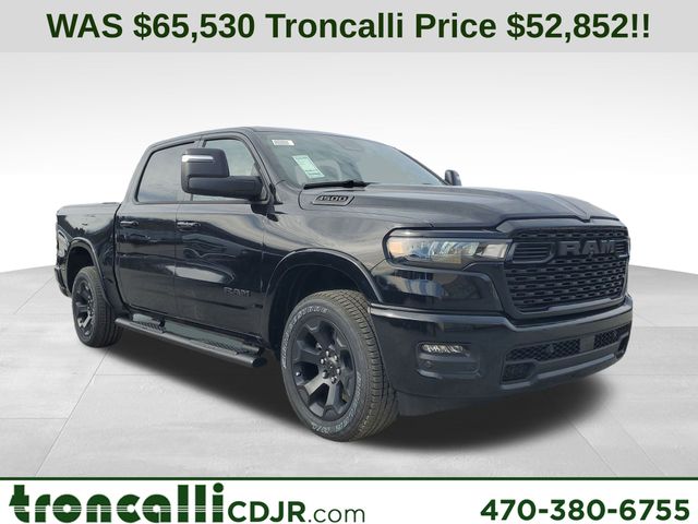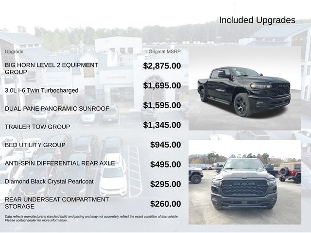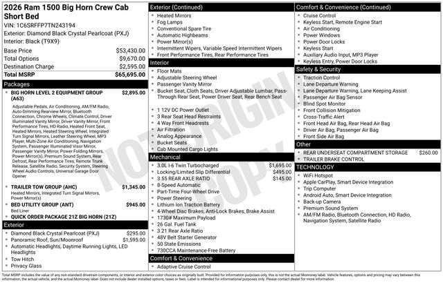 Included features are Bed Utility Group (Exterior 115V AC Outlet, MOPAR 4 Adjustable Cargo Tie-Down Hooks, MOPAR Spray in Bedliner, and Pick-Up Box Lighting), Big Horn Level 2 Equipment Group (115V Auxiliary Power Outlet, 115V Auxiliary Rear Power Outlet, 12" Touchscreen Display, 2nd Row in Floor Storage Bins, 3 Rear Seat Head Restraints, 4 Way Front Headrests, 400W Inverter, 4G LTE Wi-Fi Hot Spot, 9 Amplified Speakers with Subwoofer, Air Conditioning ATC with Dual Zone Control, Apple CarPlay, Auto Power-Folding Mirrors, Auto-Dimming Exterior Driver Mirror, Auto-Dimming Rear-View Mirror, Black Exterior Mirrors, Black Premium Power Mirrors, Body Color Fender Flares, Bucket Seats, Center Console Parts Module, Cluster 7.0" TFT Color Display, Configurable Drive Mode, Connected Travel and Traffic Services, Connectivity - US/Canada, Convex Wide-Angle Exterior Mirror Insert, Deluxe Cloth Bucket Seats, Disassociated Touchscreen Display, Exterior Mirrors Courtesy Lamps, Exterior Mirrors with Heating Element, Exterior Mirrors with Supplemental Signals, Front Seat Back Map Pockets, Full Length Floor Console, Global Telematics Box Module, Glove Box Lamp, Google Android Auto, GPS Antenna Input, GPS Navigation, HD Radio, Heated Front Seats, Heated Steering Wheel, Integrated Center Stack Radio, Integrated Voice Command with Bluetooth, Leather Wrapped Steering Wheel, LED Dome Lamp with on/Off Switch, LED Footwell Lighting, Manual Adjust 4-Way Front Passenger Seat, Media Hub with 2 Charge Only USBs, Overhead LED Lamps, Power 2-Way Driver Lumbar Adjust, Power Adjust 8-Way Driver Seat, Power Adjustable Pedals, Premium Overhead Console, Radio: Uconnect 5 Navigation with 12.0" Display, Rear 60/40 Folding Seat, Rear Center Armrest, Rear Power Sliding Window, Rear Window Defroster, Remote Tailgate Release, Security Alarm, SiriusXM Radio Service, SiriusXM with 360L, Steering Wheel Mounted Audio Controls, Sun Visors with Illuminated Vanity Mirrors, Universal Garage Door Opener, and USB Host Flip), Night Edition (Accent Color Door Handles, Accent Color Premium Power Mirrors, Accent Color Tailgate Handle, Anti-Spin Differential Rear Axle, Black Exterior Truck Badging, Black Headlamp Bezels, Black Interior Accents, Black Painted Exterior Mirrors Caps, Black Tail Lamp Bezels, Body Color Front Bumper, Body Color Rear Bumper with Step Pads, Dual Exhaust with Black Tips, Grille Black Surround Black Mesh, RAM Grille Badge - Black, and Wheels: 20" x 9.0" Aluminum Painted Clad), Quick Order Package 21Z Big Horn, Trailer Tow Group (Black Trailer Tow Power Mirrors, Manual Folding Exterior Mirrors, Manual Telescoping Mirrors, Mirror Clearance/Running Lights, Power-Adjustable Convex Aux Mirrors, Trailer Brake Control, Trailer Reverse Steering Control, Trailer Tire Pressure Monitoring System, and Trailer Tow Mirrors), 4-Wheel Disc Brakes, 48V Belt Starter Generator, 6 Speakers, ABS brakes, Air Conditioning, Alloy wheels, AM/FM radio, Apple CarPlay/Android Auto, Auto High-beam Headlights, Brake assist, Bumpers: chrome, Cloth Bucket Seats, Compass, Delay-off headlights, Dome Dual LED Reading Lamp, Driver door bin, Dual front impact airbags, Dual front side impact airbags, Dual-Pane Panoramic Sunroof, Electronic Stability Control, Front anti-roll bar, Front Bucket Seats, Front Center Armrest w/Storage, Front fog lights, Front reading lights, Front wheel independent suspension, Fully automatic headlights, Heated door mirrors, Illuminated entry, Low tire pressure warning, Manual Adjust 4-Way Driver Seat, Occupant sensing airbag, Outside temperature display, Overhead airbag, Overhead console, Panic Price includes the following rebates:$2000 - 2026 National SFS Lease Loyalty Bonus Cash . Exp. 04/30/2026 $3500 - 2026 National Retail Bonus Cash . Exp. 04/30/2026 $500 - 2026 National 2026 Military Bonus Cash . Exp. 01/04/2027 $500 - 2026 Southeast BC Retail Bonus Cash. Exp. 04/3