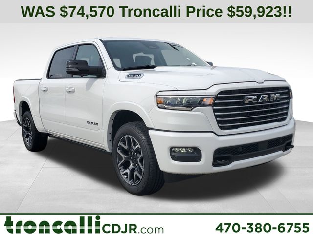 Included features are Bed Utility Group (Exterior 115V AC Outlet, MOPAR 4 Adjustable Cargo Tie-Down Hooks, and MOPAR Spray in Bedliner), Laramie Level 2 Equipment Group (14.4" Touchscreen Display, 4G LTE Wi-Fi Hot Spot, Cluster 12" TFT Color Display, Connected Travel and Traffic Services, Connectivity - US/Canada, Front Passenger Interactive Display, GPS Navigation, Harman/Kardon 19 Speaker Premium Sound, Integrated Center Stack Radio, Integrated Voice Command with Bluetooth, Power Tailgate, Radio: Uconnect 5 Nav with 14.4" Display, Rain Sensitive Windshield Wipers, SiriusXM Radio Service, SiriusXM with 360L, and USB Host Flip), Laramie Preferred Package (Accent Color Premium Power Mirrors, Auto Power-Folding Mirrors, Auto-Dimming Exterior Driver Mirror, Black Painted Exterior Mirrors Caps, Body Color Front Bumper, Body Color Rear Bumper with Step Pads, Convex Wide-Angle Exterior Mirror Insert, Dome Dual LED Reading Lamp, Dual-Pane Panoramic Sunroof, Exterior Mirrors Courtesy Lamps, Exterior Mirrors with Heating Element, Exterior Mirrors with Memory, Exterior Mirrors with Supplemental Signals, Grille Surround 3 Body Color Tex 4 Chrome, LED Dome/Reading Lamp, Power Deployable Running Boards, RAM Grille Badge - Chrome, Tow Hooks, and Trailer Brake Control), Quick Order Package 21H Laramie, 10 Speakers, 3.55 Rear Axle Ratio, 4-Wheel Disc Brakes, ABS brakes, Active Noise Control System, Adjustable pedals, Air Conditioning, Alloy wheels, AM/FM radio: SiriusXM with 360L, Anti-Spin Differential Rear Axle, Apple CarPlay/Android Auto, Audio memory, Auto High-beam Headlights, Auto-dimming door mirrors, Auto-dimming Rear-View mirror, Automatic temperature control, Brake assist, Bumpers: chrome, Chrome Exterior Mirrors, Compass, Delay-off headlights, Driver door bin, Driver vanity mirror, Dual front impact airbags, Dual front side impact airbags, Electronic Stability Control, Front anti-roll bar, Front Bucket Seats, Front Center Armrest w/Storage, Front dual zone A/C, Front fog lights, Front reading lights, Front wheel independent suspension, Fully automatic headlights, Garage door transmitter, Heated door mirrors, Heated front seats, Heated rear seats, Heated steering wheel, Illuminated entry, Leather steering wheel, Leather Trimmed Bucket Seats, Low tire pressure warning, Memory seat, MOPAR Front and Rear Rubber Floor Mats, Navigation System, Occupant sensing airbag, Off-Road Information Pages, Outside temperature display, Overhead airbag, Overhead console, Panic alarm, ParkView Rear Back-Up Camera, Passenger door bin, Passenger vanity mirror, Pedal memory, Power door mirrors, Power driver seat, Power passenger seat, Power steering, Power windows, Radio data system, Radio: Uconnect 5 Navigation with 12.0" Display, Rear anti-roll bar, Rear reading lights, Rear seat center armrest, Rear step bumper, Remote keyless entry, Security system, Speed control, Split folding rear seat, Steering wheel mounted audio controls, Tachometer, Telescoping steering wheel, Tilt steering wheel, Traction control, Trip computer, Turn signal indicator mirrors, Variably intermittent wipers, Ventilated front seats, Voltmeter, and Wheels: 20" x 9" Premium Paint/Polish. Price includes the following rebates:$1500 - 2026 Southeast BC Retail Bonus Cash. Exp. 04/30/2026 $2000 - 2026 National SFS Lease Loyalty Bonus Cash . Exp. 04/30/2026 $3500 - 2026 National Retail Bonus Cash . Exp. 04/30/2026 $500 - 2026 National 2026 Military Bonus Cash . Exp. 01/04/2027