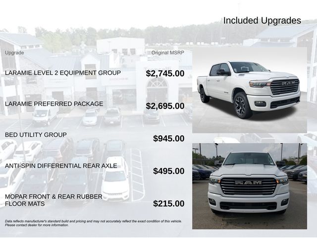 Included features are Bed Utility Group (Exterior 115V AC Outlet, MOPAR 4 Adjustable Cargo Tie-Down Hooks, and MOPAR Spray in Bedliner), Laramie Level 2 Equipment Group (14.4" Touchscreen Display, 4G LTE Wi-Fi Hot Spot, Cluster 12" TFT Color Display, Connected Travel and Traffic Services, Connectivity - US/Canada, Front Passenger Interactive Display, GPS Navigation, Harman/Kardon 19 Speaker Premium Sound, Integrated Center Stack Radio, Integrated Voice Command with Bluetooth, Power Tailgate, Radio: Uconnect 5 Nav with 14.4" Display, Rain Sensitive Windshield Wipers, SiriusXM Radio Service, SiriusXM with 360L, and USB Host Flip), Laramie Preferred Package (Accent Color Premium Power Mirrors, Auto Power-Folding Mirrors, Auto-Dimming Exterior Driver Mirror, Black Painted Exterior Mirrors Caps, Body Color Front Bumper, Body Color Rear Bumper with Step Pads, Convex Wide-Angle Exterior Mirror Insert, Dome Dual LED Reading Lamp, Dual-Pane Panoramic Sunroof, Exterior Mirrors Courtesy Lamps, Exterior Mirrors with Heating Element, Exterior Mirrors with Memory, Exterior Mirrors with Supplemental Signals, Grille Surround 3 Body Color Tex 4 Chrome, LED Dome/Reading Lamp, Power Deployable Running Boards, RAM Grille Badge - Chrome, Tow Hooks, and Trailer Brake Control), Quick Order Package 21H Laramie, 10 Speakers, 3.55 Rear Axle Ratio, 4-Wheel Disc Brakes, ABS brakes, Active Noise Control System, Adjustable pedals, Air Conditioning, Alloy wheels, AM/FM radio: SiriusXM with 360L, Anti-Spin Differential Rear Axle, Apple CarPlay/Android Auto, Audio memory, Auto High-beam Headlights, Auto-dimming door mirrors, Auto-dimming Rear-View mirror, Automatic temperature control, Brake assist, Bumpers: chrome, Chrome Exterior Mirrors, Compass, Delay-off headlights, Driver door bin, Driver vanity mirror, Dual front impact airbags, Dual front side impact airbags, Electronic Stability Control, Front anti-roll bar, Front Bucket Seats, Front Center Armrest w/Storage, Front dual zone A/C, Front fog lights, Front reading lights, Front wheel independent suspension, Fully automatic headlights, Garage door transmitter, Heated door mirrors, Heated front seats, Heated rear seats, Heated steering wheel, Illuminated entry, Leather steering wheel, Leather Trimmed Bucket Seats, Low tire pressure warning, Memory seat, MOPAR Front and Rear Rubber Floor Mats, Navigation System, Occupant sensing airbag, Off-Road Information Pages, Outside temperature display, Overhead airbag, Overhead console, Panic alarm, ParkView Rear Back-Up Camera, Passenger door bin, Passenger vanity mirror, Pedal memory, Power door mirrors, Power driver seat, Power passenger seat, Power steering, Power windows, Radio data system, Radio: Uconnect 5 Navigation with 12.0" Display, Rear anti-roll bar, Rear reading lights, Rear seat center armrest, Rear step bumper, Remote keyless entry, Security system, Speed control, Split folding rear seat, Steering wheel mounted audio controls, Tachometer, Telescoping steering wheel, Tilt steering wheel, Traction control, Trip computer, Turn signal indicator mirrors, Variably intermittent wipers, Ventilated front seats, Voltmeter, and Wheels: 20" x 9" Premium Paint/Polish. Price includes the following rebates:$2000 - 2026 National SFS Lease Loyalty Bonus Cash . Exp. 04/30/2026 $3500 - 2026 National Retail Bonus Cash . Exp. 04/30/2026 $500 - 2026 National 2026 Military Bonus Cash . Exp. 01/04/2027
