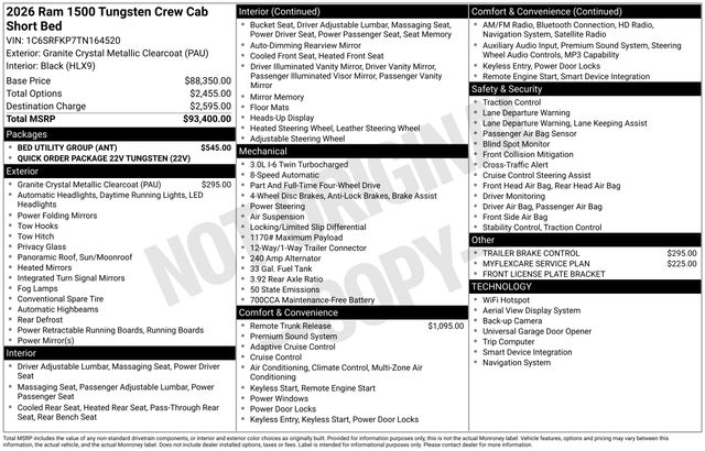 Granite Crystal Metallic Clearcoat 2026 Ram 1500 Tungsten Tungsten 4WD Price includes the following rebates:$1000 - 2026 National Bonus Cash . Exp. 03/31/2026 $2000 - 2026 National SFS Lease Loyalty Bonus Cash . Exp. 03/31/2026 $500 - 2026 National 2026 Military Bonus Cash . Exp. 01/04/2027