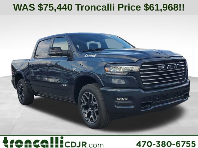 Included features are Bed Utility Group (Exterior 115V AC Outlet, MOPAR 4 Adjustable Cargo Tie-Down Hooks, and MOPAR Spray in Bedliner), Laramie Level 2 Equipment Group (14.4" Touchscreen Display, 4G LTE Wi-Fi Hot Spot, Cluster 12" TFT Color Display, Connected Travel and Traffic Services, Connectivity - US/Canada, Front Passenger Interactive Display, GPS Navigation, Harman/Kardon 19 Speaker Premium Sound, Integrated Center Stack Radio, Integrated Voice Command with Bluetooth, Power Tailgate, Radio: Uconnect 5 Nav with 14.4" Display, Rain Sensitive Windshield Wipers, SiriusXM Radio Service, SiriusXM with 360L, and USB Host Flip), Laramie Preferred Package (Accent Color Premium Power Mirrors, Auto Power-Folding Mirrors, Auto-Dimming Exterior Driver Mirror, Black Painted Exterior Mirrors Caps, Body Color Front Bumper, Body Color Rear Bumper with Step Pads, Convex Wide-Angle Exterior Mirror Insert, Dome Dual LED Reading Lamp, Dual-Pane Panoramic Sunroof, Exterior Mirrors Courtesy Lamps, Exterior Mirrors with Heating Element, Exterior Mirrors with Memory, Exterior Mirrors with Supplemental Signals, Grille Surround 3 Body Color Tex 4 Chrome, LED Dome/Reading Lamp, Power Deployable Running Boards, RAM Grille Badge - Chrome, Tow Hooks, and Trailer Brake Control), Quick Order Package 27H Laramie, 10 Speakers, 4-Wheel Disc Brakes, ABS brakes, Active Noise Control System, Adjustable pedals, Air Conditioning, Alloy wheels, AM/FM radio: SiriusXM with 360L, Apple CarPlay/Android Auto, Audio memory, Auto High-beam Headlights, Auto-dimming door mirrors, Auto-dimming Rear-View mirror, Automatic temperature control, Brake assist, Bumpers: chrome, Chrome Exterior Mirrors, Compass, Delay-off headlights, Driver door bin, Driver vanity mirror, Dual front impact airbags, Dual front side impact airbags, Electronic Stability Control, Front anti-roll bar, Front Bucket Seats, Front Center Armrest w/Storage, Front dual zone A/C, Front fog lights, Front reading lights, Front wheel independent suspension, Fully automatic headlights, Garage door transmitter, Heated door mirrors, Heated front seats, Heated rear seats, Heated steering wheel, Illuminated entry, Leather steering wheel, Leather Trimmed Bucket Seats, Low tire pressure warning, Memory seat, MOPAR Front and Rear Rubber Floor Mats, MyFlexCare Service Plan, Navigation System, Occupant sensing airbag, Off-Road Information Pages, Outside temperature display, Overhead airbag, Overhead console, Panic alarm, ParkView Rear Back-Up Camera, Passenger door bin, Passenger vanity mirror, Pedal memory, Power door mirrors, Power driver seat, Power passenger seat, Power steering, Power windows, Radio data system, Radio: Uconnect 5 Navigation with 12.0" Display, Rear anti-roll bar, Rear reading lights, Rear seat center armrest, Rear step bumper, Remote keyless entry, Security system, Speed control, Split folding rear seat, Steering wheel mounted audio controls, Tachometer, Telescoping steering wheel, Tilt steering wheel, Traction control, Trip computer, Turn signal indicator mirrors, Variably intermittent wipers, Ventilated front seats, Voltmeter, and Wheels: 20" x 9" Premium Paint/Polish. Price includes the following rebates:$2000 - 2026 National SFS Lease Loyalty Bonus Cash . Exp. 04/30/2026 $3500 - 2026 National Retail Bonus Cash . Exp. 04/30/2026 $500 - 2026 National 2026 Military Bonus Cash . Exp. 01/04/2027