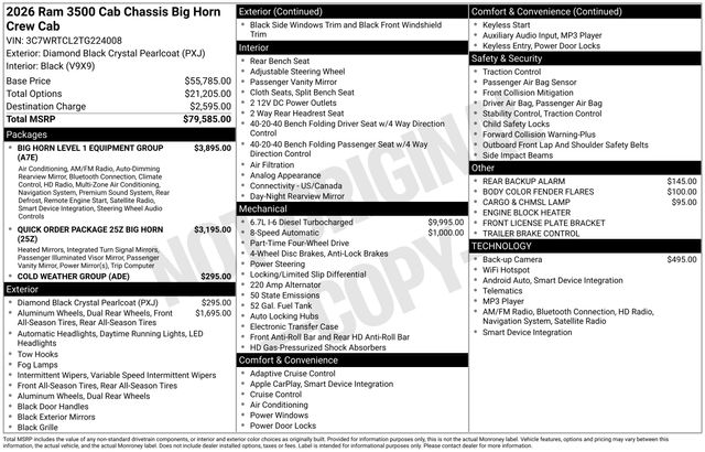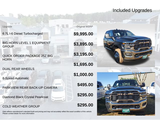 Included features are Big Horn Level 1 Equipment Group (115V Auxiliary Power Outlet, 12.0" Touchscreen Display, 400W Inverter, 4G LTE Wi-Fi Hot Spot, 9 Alpine Speakers with Subwoofer, Air Conditioning ATC with Dual Zone Control, Alexa Built-in, Apple CarPlay, Black Wheel Flares, Cluster 7.0" TFT Color Display, Connected Travel and Traffic Services, Connectivity - US/Canada, Courtesy Lamps, Digital Rearview Mirror, Disassociated Touchscreen Display, Dual Glove Boxes, Foam Bottle Insert (door Trim Panel), For Details, Visit DriveUconnect.com, For More Info, Call 800-643-2112, Global Telematics Box Module, Glove Box Lamp, Google Android Auto, GPS Antenna Input, GPS Navigation, HD Radio, Integrated Voice Command with Bluetooth, Locking Lower Glove Box, Luxury Steering Wheel, Off-Road Information Pages, Power Rear Sliding Window, Radio: Uconnect 5 Navigation with 12.0" Display, Rear Dome with on/Off Switch Lamp, Rear Window Defroster, Remote Start System, SiriusXM Radio Service, SiriusXM with 360L, Steering Wheel Mounted Audio Controls, Temperature and Compass Gauge, and Trailer Tow Pages), Cold Weather Group (Engine Block Heater and MOPAR Winter Front Grille Cover), Quick Order Package 25Z Big Horn (2 Way Rear Headrest Seat, 4 Way Front Headrests, 40/20/40 Split Bench Seat, Acoustic Front Door Glass, Black Exterior Mirrors, Black Power Heated Fold Telescope Mirrors, Black-Out Tape, Body Insulation, Bright Front Bumper, Center Hub, Chrome Grille Surround, Cloth 40/20/40 Bench Seat, Exterior Mirrors Courtesy Lamps, Exterior Mirrors with Heating Element, Exterior Mirrors with Supplemental Signals, Front Armrest with Cupholders, Manual Adjust 4-Way Driver Seat, Manual Adjust 4-Way Front Passenger Seat, Manual Folding Exterior Mirrors, Manual Telescoping Mirrors, Matte Black Mesh Grille with Chrome, Mirror Running Lights, Painted I/P Bezels with Hydrographics, Passenger Sun Visor with Illuminated Mirror, Power Adjust Mirrors, Power-Adjustable Convex Aux Mirrors, Premium Vinyl Door Trim with Map Pocket, RAM Door Badges, Rear Folding Seat, Remote USB Port - Charge Only, Satin Chrome Key Fob, Storage Tray, Tinted Acoustic Windshield Glass, Trailer Brake Control, Trailer Light Check, Traveler/Mini Trip Computer, and Wheels: 18" x 8.0" Polished Aluminum), 11.50" Dual Wheels Rear Axle, 4-Wheel Disc Brakes, 6 Speakers, 6000# Front Axle with Hub Extension, ABS brakes, Air Conditioning, AM/FM radio: SiriusXM, Apple CarPlay/Android Auto, Black Wheel Center Hub, Body Color Fender Flares, Cargo and CHMSL Lamp, Compass, Delay-off headlights, Driver door bin, Dual front impact airbags, Dual Rear Wheels, Electronic Stability Control, Emergency communication system: RAM Connect, Front anti-roll bar, Front Center Armrest w/Storage, Front fog lights, Front License Plate Bracket, Front reading lights, Fully automatic headlights, HD Vinyl 40/20/40 Split Bench Seat, Illuminated entry, Nexen Brand Tires, Occupant sensing airbag, Outside temperature display, Overhead console, Panic alarm, ParkView Rear Back-Up Camera, Passenger door bin, Passenger vanity mirror, Power steering, Power windows, Radio data system, Radio: Uconnect 5 with 8.4" Display, Rear anti-roll bar, Rear Backup Alarm, Remote keyless entry, Speed control, Tachometer, Tilt steering wheel, Traction control, Variably intermittent wipers, Voltmeter, Wheels: 17" x 6.0" Polished Aluminum, and Wheels: 18" x 8.0" Steel PainteD. Price includes the following rebates:$2500 - 2026 National Bonus Cash . Exp. 04/30/2026 $500 - 2026 National 2026 Military Bonus Cash . Exp. 01/04/2027