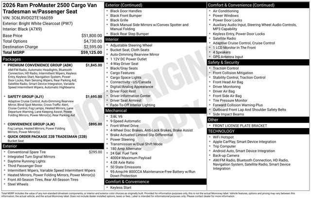 Included features are Convenience Group (Exterior Mirrors with Heating Element, Exterior Mirrors with Supplemental Signals, Front Fog Lamps, Power Adjust Mirrors, Power Folding/Heated Mirrors, Power-Adjustable Convex Aux Mirrors, Power-Folding Mirrors, and Rear Cargo LED Lamp), Premium Convenience Group (10.1" Touchscreen Display, 4G LTE Wi-Fi Hotspot, Apple CarPlay, Connected Travel and Traffic Services, Connectivity - US/Canada, Disassociated Touchscreen Display, For Details, Visit DriveUconnect.com, For More Info, Call 800-643-2112, Global Telematics Box Module, Google Android Auto, GPS Antenna Input, GPS Navigation, HD Radio, Integrated Center Stack Radio, Integrated Voice Command with Bluetooth, Passive Entry, Radio: Uconnect 5 Nav with 10.1" Display, SiriusXM Radio Service, SiriusXM with 360L, Traffic Sign Information, and Wireless Charging Pad), Quick Order Package 22B Tradesman (4-Way Manual Adjust Front Passenger Seat and Passenger Bucket Seat), Safety Group (Blind Spot and Cross Path Detection, Digital Rearview Mirror with Autodim, Intelligent Speed Assist (ISA), Lane Departure Warning Plus, and ParkSense Front/Rear Park Assist System), 4 Speakers, 4-Wheel Disc Brakes, 4.08 Axle Ratio, ABS brakes, Adaptive Cruise Control with Stop and Go, Air Conditioning, AM/FM radio: SiriusXM, Apple CarPlay/Android Auto, Black/Gray Seats, Bodyside moldings, Brake assist, Cloth Bucket Seats, Driver door bin, Driver Seat Armrest, Driver's Seat Mounted Armrest, Electronic Stability Control, Front anti-roll bar, Front Bucket Seats, Front License Plate Bracket, Front reading lights, Front wheel independent suspension, Heavy Duty Suspension, Illuminated entry, Low tire pressure warning, Outside temperature display, Overhead airbag, Overhead console, ParkView Rear Back-Up Camera, Passenger door bin, Power steering, Power windows, Radio: Uconnect 5 with 7" Display, Remote keyless entry, Steering wheel mounted audio controls, Tachometer, Telescoping steering wheel, Traction control, Trip computer, Turn signal indicator mirrors, Variably intermittent wipers, Wheel Center Cap, and Wheels: 16" x 6.0" SteeL. Price includes the following rebates:$4000 - 2026 National Bonus Cash . Exp. 03/31/2026 $500 - 2026 National 2026 Military Bonus Cash . Exp. 01/04/2027