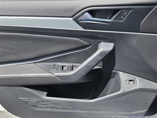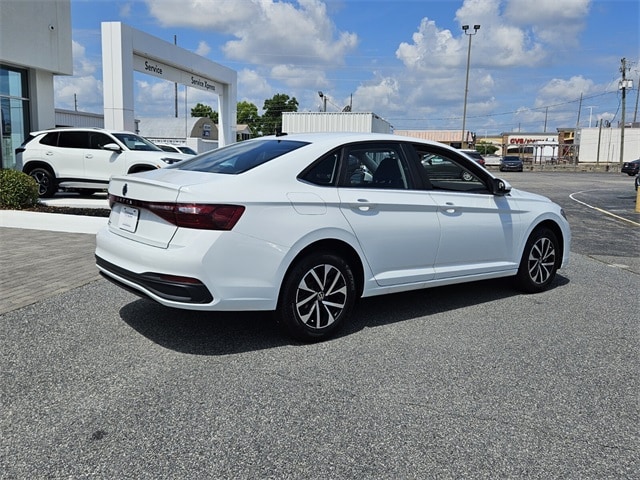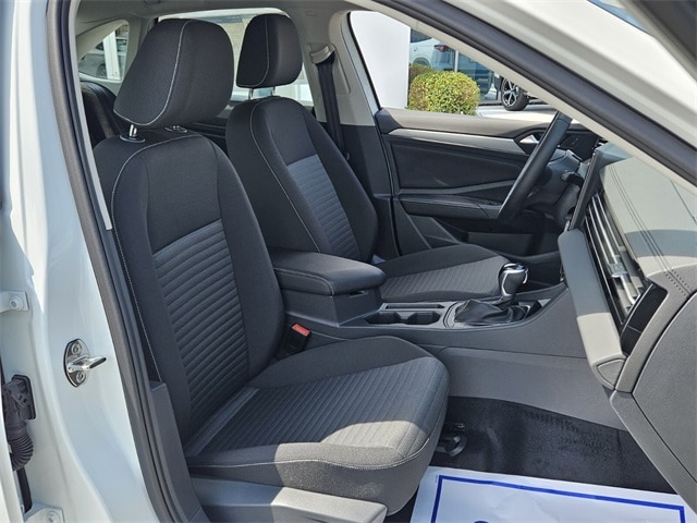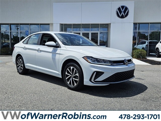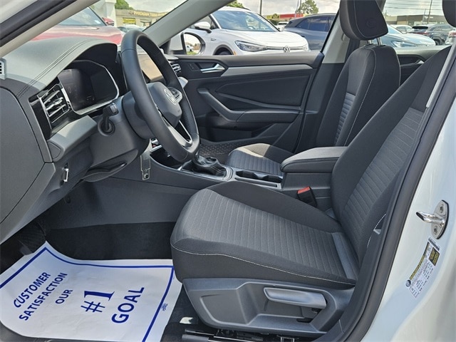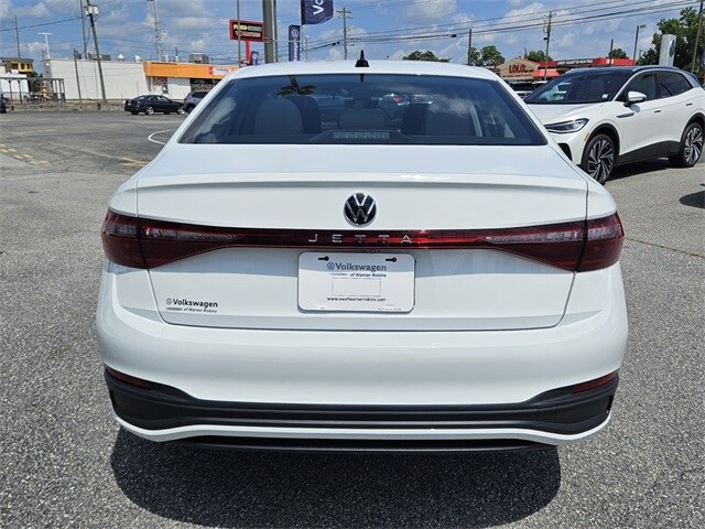 White 2025 Volkswagen Jetta 1.5T S FWD 8-Speed Automatic with Tiptronic 1.5L I-4 DI DOHC Turbocharged Titan Blk Clth Cloth, 4 Speakers, 4-Wheel Disc Brakes, ABS brakes, Active Blind Spot Monitor, Air Conditioning, Alloy wheels, Auto-dimming Rear-View mirror, Automatic temperature control, Brake assist, Bumpers: body-color, Cloth Seat Trim, Delay-off headlights, Driver door bin, Driver vanity mirror, Dual front impact airbags, Dual front side impact airbags, Electronic Stability Control, Emergency communication system: VW Car-Net Safe & Secure 5-year, Exterior Parking Camera Rear, Front anti-roll bar, Front Bucket Seats, Front Center Armrest, Front dual zone A/C, Front Seats, Front wheel independent suspension, Fully automatic headlights, Heated door mirrors, Illuminated entry, Leather Shift Knob, Leather steering wheel, Low tire pressure warning, Occupant sensing airbag, Outside temperature display, Overhead airbag, Overhead console, Panic alarm, Passenger door bin, Passenger vanity mirror, Power door mirrors, Power steering, Power windows, Radio data system, Radio: MIB3 Composition Color w/8" Touchscreen, Rain sensing wipers, Rear anti-roll bar, Rear reading lights, Rear window defroster, Remote keyless entry, Speed control, Speed-sensing steering, Split folding rear seat, Steering wheel mounted audio controls, Tachometer, Telescoping steering wheel, Tilt steering wheel, Traction control, Trip computer, Variably intermittent wipers, Wheels: 16" 2-Tone Machined Alloy, Titan Blk Clth Cloth.