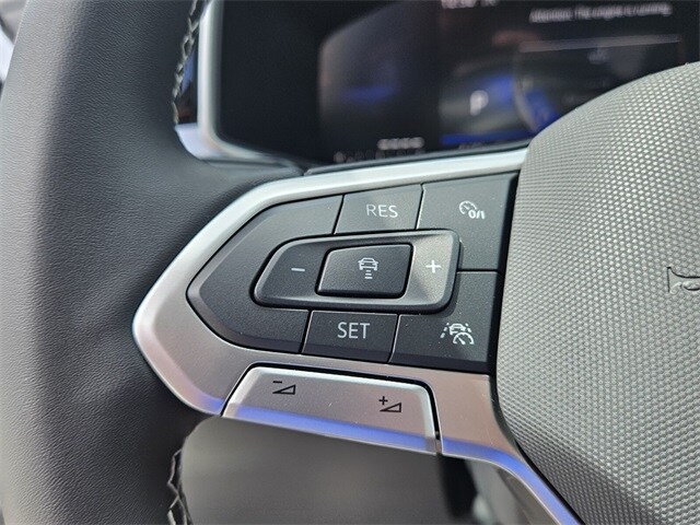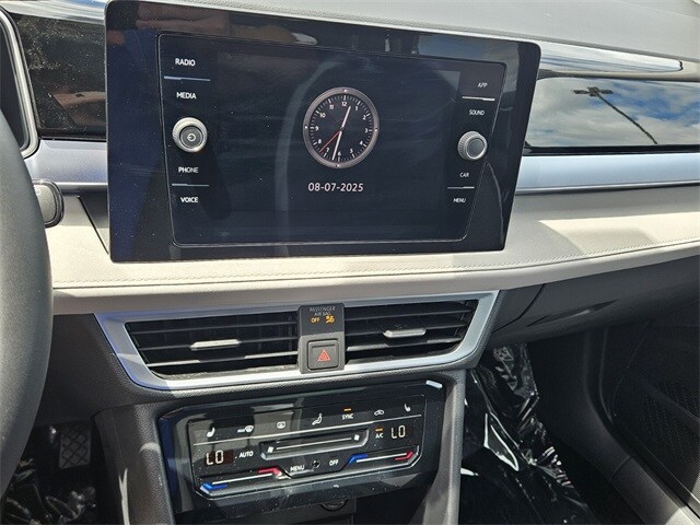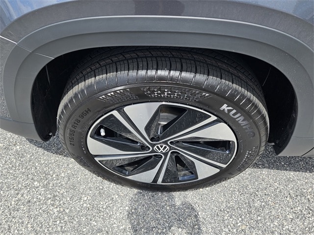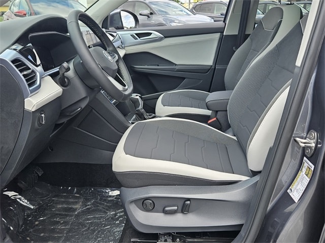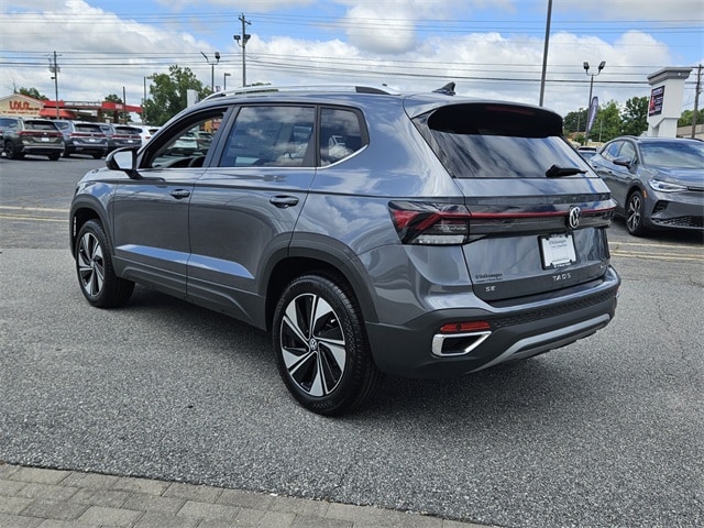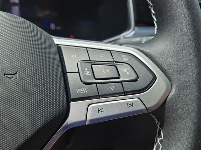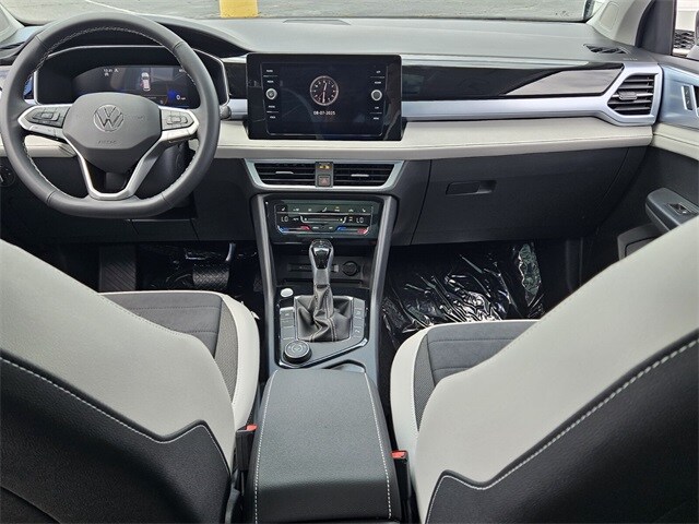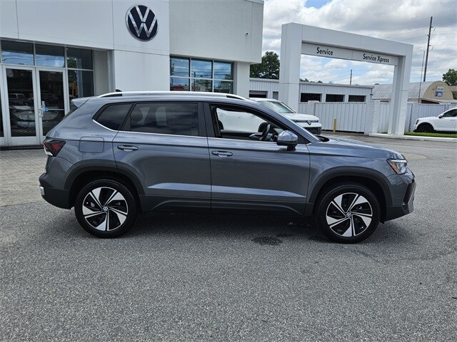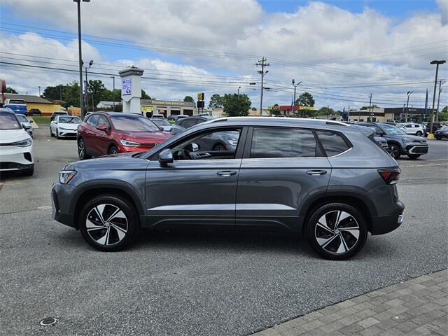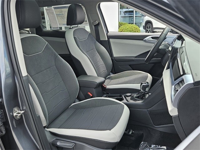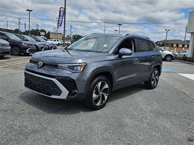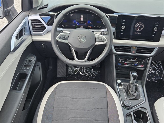 Gray Metallic 2025 Volkswagen Taos 1.5T SE AWD 8-Speed Automatic with Tiptronic 1.5L I4 Turbocharged DOHC 16V LEV3-SULEV30 174hp 4-Wheel Disc Brakes, 6 Speakers, ABS brakes, Active Blind Spot Monitor, Air Conditioning, Alloy wheels, AM/FM radio: SiriusXM with 360L, Auto High-beam Headlights, Automatic temperature control, Brake assist, Bumpers: body-color, CloudTex & Cloth Seating Surfaces, Compass, Delay-off headlights, Driver door bin, Driver vanity mirror, Dual front impact airbags, Dual front side impact airbags, Electronic Stability Control, Emergency communication system: VW Car-Net Safe & Secure 5-year, Exterior Parking Camera Rear, Four wheel independent suspension, Front anti-roll bar, Front Bucket Seats, Front Center Armrest, Front dual zone A/C, Front reading lights, Front Strut Rear Multi-Link Suspension, Fully automatic headlights, Heated door mirrors, Heated Front Bucket Seats, Heated front seats, Heated steering wheel, Illuminated entry, Leather Shift Knob, Low tire pressure warning, Occupant sensing airbag, Outside temperature display, Overhead airbag, Overhead console, Panic alarm, Passenger door bin, Passenger vanity mirror, Power door mirrors, Power driver seat, Power steering, Power windows, Radio data system, Radio: MIB3 Composition Media AM/FM/HD, Rain sensing wipers, Rear anti-roll bar, Rear seat center armrest, Rear window defroster, Rear window wiper, Remote keyless entry, Security system, Speed control, Speed-sensing steering, Split folding rear seat, Spoiler, Steering wheel mounted audio controls, Tachometer, Telescoping steering wheel, Tilt steering wheel, Traction control, Trip computer, Variably intermittent wipers, Wheels: 18" 2-Tone Machined Alloy.