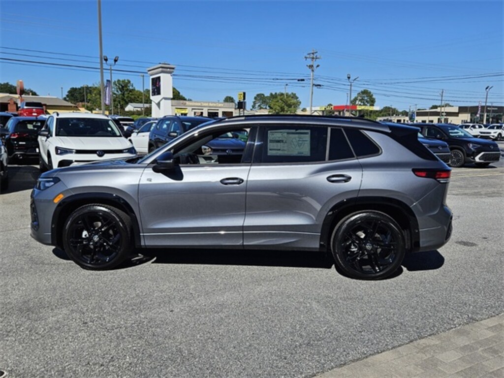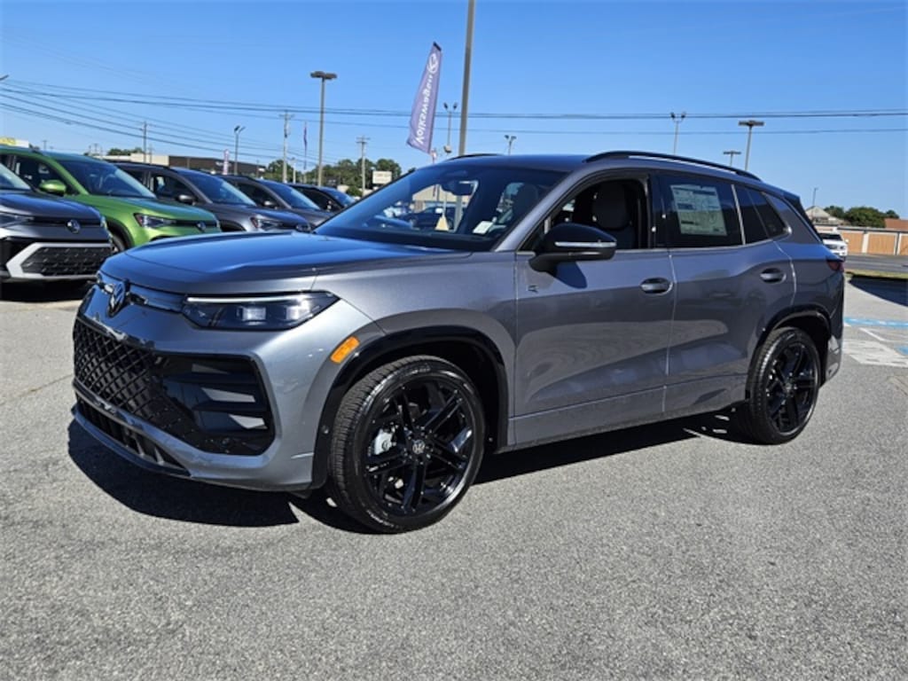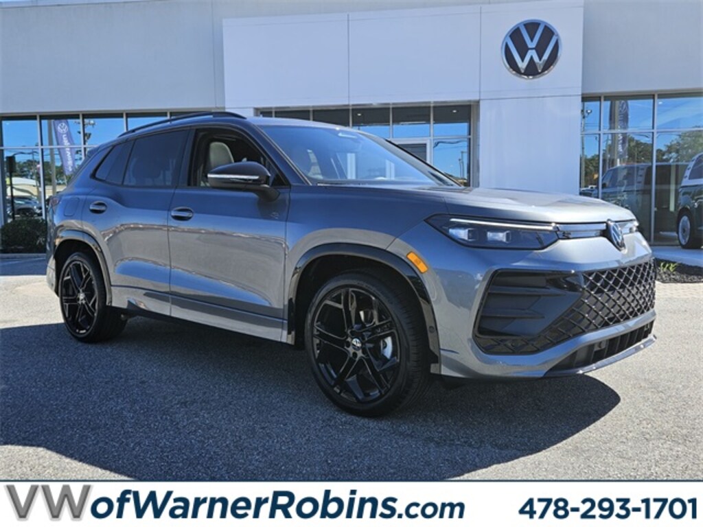 Gray Metallic 2025 Volkswagen Tiguan 2.0T SE R-Line Black FWD 8-Speed Automatic 2.0L TSI DOHC 4-Wheel Disc Brakes, 4-Wheel Independent Suspension, 7 Speakers, ABS brakes, Air Conditioning, Alloy wheels, AM/FM radio: SiriusXM with 360L, Auto High-beam Headlights, Auto-dimming Rear-View mirror, Automatic temperature control, Brake assist, Bumpers: body-color, Compass, Delay-off headlights, Driver door bin, Driver vanity mirror, Dual front impact airbags, Dual front side impact airbags, Electronic Stability Control, Emergency communication system: VW Car-Net Safe & Secure 5-year, Exterior Parking Camera Rear, Four wheel independent suspension, Front anti-roll bar, Front Bucket Seats, Front Center Armrest, Front dual zone A/C, Front reading lights, Fully automatic headlights, Heads-Up Display, Heated door mirrors, Heated Front Seats, Heated front seats, Illuminated entry, Knee airbag, Leather Shift Knob, Leather steering wheel, Low tire pressure warning, Occupant sensing airbag, Outside temperature display, Overhead airbag, Overhead console, Panic alarm, Passenger door bin, Passenger vanity mirror, Perforated V-Tex Leatherette Seating Surfaces, Power door mirrors, Power driver seat, Power Liftgate, Power moonroof, Power steering, Power windows, Radio data system, Radio: MIB4 Composition Media Touchscreen AM/FM, Rain sensing wipers, Rear anti-roll bar, Rear reading lights, Rear seat center armrest, Rear side impact airbag, Rear window defroster, Rear window wiper, Remote keyless entry, Security system, Speed control, Speed-sensing steering, Split folding rear seat, Spoiler, Sport steering wheel, Steering wheel mounted audio controls, Tachometer, Telescoping steering wheel, Tilt steering wheel, Traction control, Trip computer, Turn signal indicator mirrors, Variably intermittent wipers, Wheels: 20" Black Painted Alloy.
