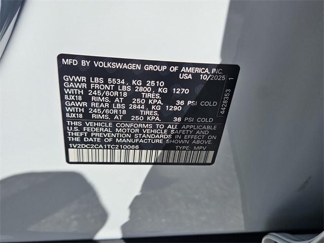 Opal 2026 Volkswagen Atlas Cross Sport 2.0T SE FWD 8-Speed Automatic with Tiptronic 2.0L TSI 4-Wheel Disc Brakes, 4-Wheel Independent Suspension, 6 Speakers, ABS brakes, Air Conditioning, Alloy wheels, AM/FM radio: SiriusXM with 360L, Auto High-beam Headlights, Auto-dimming Rear-View mirror, Automatic temperature control, Brake assist, Bumpers: body-color, Delay-off headlights, Driver door bin, Driver vanity mirror, Dual front impact airbags, Dual front side impact airbags, Electronic Stability Control, Emergency communication system: VW Car-Net Safe & Secure 5-year, Exterior Parking Camera Rear, Four wheel independent suspension, Front anti-roll bar, Front Bucket Seats, Front Center Armrest, Front dual zone A/C, Front fog lights, Front reading lights, Fully automatic headlights, Heated door mirrors, Heated front seats, Heated steering wheel, Illuminated entry, Low tire pressure warning, Occupant sensing airbag, Outside temperature display, Overhead airbag, Overhead console, Panic alarm, Passenger door bin, Passenger vanity mirror, Perforated V-Tex Leatherette Seating Surfaces, Power door mirrors, Power driver seat, Power steering, Power windows, Radio data system, Rain sensing wipers, Rear anti-roll bar, Rear reading lights, Rear seat center armrest, Rear window defroster, Rear window wiper, Remote keyless entry, Security system, Speed control, Speed-sensing steering, Split folding rear seat, Spoiler, Steering wheel mounted audio controls, Tachometer, Telescoping steering wheel, Tilt steering wheel, Traction control, Trip computer, Turn signal indicator mirrors, Variably intermittent wipers, Ventilated front seats, Wheels: 18" 5-Spoke 2-Tone Machined Alloy.