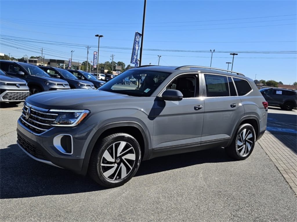 Gray 2026 Volkswagen Atlas 2.0T SE w/Technology AWD 8-Speed Automatic with Tiptronic 2.0L TSI 3rd row seats: split-bench, 4-Wheel Disc Brakes, 6 Speakers, ABS brakes, Air Conditioning, Alloy wheels, AM/FM radio: SiriusXM with 360L, Auto High-beam Headlights, Auto-dimming Rear-View mirror, Automatic temperature control, Brake assist, Bumpers: body-color, Compass, Delay-off headlights, Driver door bin, Driver vanity mirror, Dual front impact airbags, Dual front side impact airbags, Electronic Stability Control, Emergency communication system, Exterior Parking Camera Rear, Four wheel independent suspension, Four-wheel Independent Suspension, Front anti-roll bar, Front Bucket Seats, Front Center Armrest, Front dual zone A/C, Front fog lights, Front reading lights, Fully automatic headlights, Garage door transmitter: HomeLink Connect, Heated & Actively Ventilated Front Bucket Seats, Heated door mirrors, Heated front seats, Heated steering wheel, Illuminated entry, Low tire pressure warning, Occupant sensing airbag, Outside temperature display, Overhead airbag, Overhead console, Panic alarm, Passenger door bin, Passenger vanity mirror, Perforated V-Tex Leatherette Seating Surfaces, Power door mirrors, Power driver seat, Power Liftgate, Power steering, Power windows, Radio data system, Radio: MIB3 Composition Media, Rain sensing wipers, Rear air conditioning, Rear anti-roll bar, Rear reading lights, Rear seat center armrest, Rear window defroster, Rear window wiper, Remote keyless entry, Security system, Speed control, Speed-sensing steering, Split folding rear seat, Spoiler, Steering wheel mounted audio controls, Tachometer, Telescoping steering wheel, Tilt steering wheel, Traction control, Trip computer, Turn signal indicator mirrors, Variably intermittent wipers, Ventilated front seats, Wheels: 20" 2-Tone Machined Alloy.