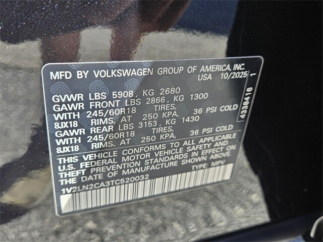 Pearl 2026 Volkswagen Atlas 2.0T SE AWD 8-Speed Automatic with Tiptronic 2.0L TSI 3rd row seats: split-bench, 4-Wheel Disc Brakes, 6 Speakers, ABS brakes, Air Conditioning, Alloy wheels, AM/FM radio: SiriusXM with 360L, Auto High-beam Headlights, Auto-dimming Rear-View mirror, Automatic temperature control, Brake assist, Bumpers: body-color, Delay-off headlights, Driver door bin, Driver vanity mirror, Dual front impact airbags, Dual front side impact airbags, Electronic Stability Control, Emergency communication system: VW Car-Net Safe & Secure 5-year, Exterior Parking Camera Rear, Four wheel independent suspension, Front anti-roll bar, Front Bucket Seats, Front Center Armrest, Front dual zone A/C, Front fog lights, Front reading lights, Fully automatic headlights, Heated & Actively Ventilated Front Bucket Seats, Heated door mirrors, Heated front seats, Heated steering wheel, Illuminated entry, Low tire pressure warning, Occupant sensing airbag, Outside temperature display, Overhead airbag, Overhead console, Panic alarm, Passenger door bin, Passenger vanity mirror, Perforated V-Tex Leatherette Seating Surfaces, Power door mirrors, Power driver seat, Power steering, Power windows, Radio data system, Radio: MIB3 Composition Media, Rain sensing wipers, Rear air conditioning, Rear anti-roll bar, Rear reading lights, Rear seat center armrest, Rear window defroster, Rear window wiper, Remote keyless entry, Security system, Speed control, Speed-sensing steering, Split folding rear seat, Spoiler, Steering wheel mounted audio controls, Tachometer, Telescoping steering wheel, Tilt steering wheel, Traction control, Trip computer, Turn signal indicator mirrors, Variably intermittent wipers, Ventilated front seats, Wheels: 18" 2-Tone Machined Alloy.