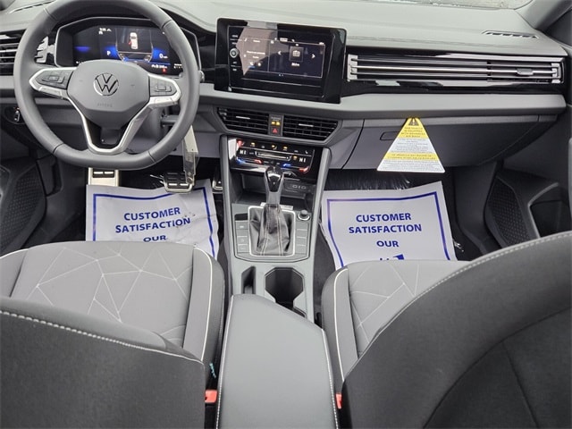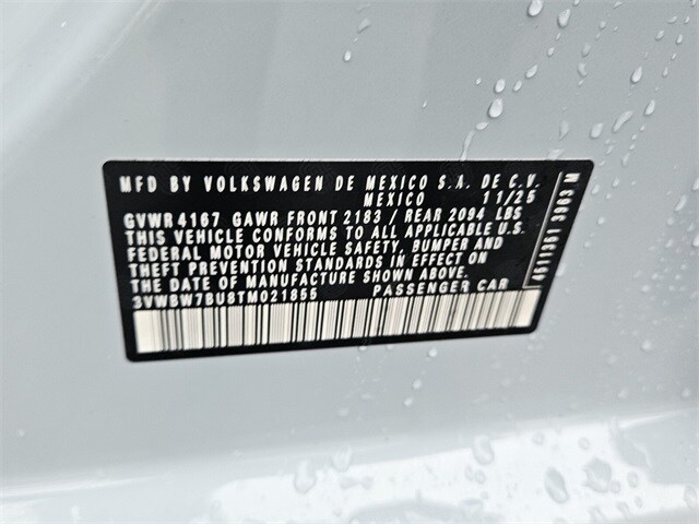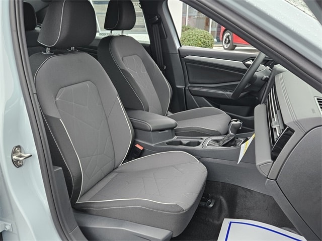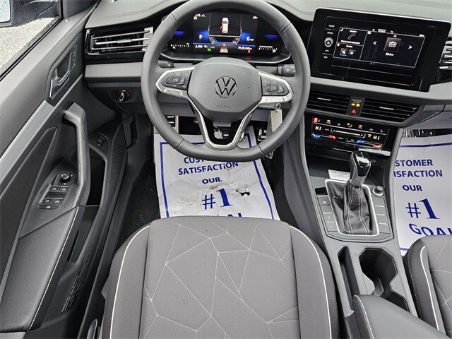 Gray 2026 Volkswagen Jetta 1.5T Sport FWD 8-Speed Automatic with Tiptronic 1.5L I-4 DI DOHC Turbocharged Black Cloth, 4 Speakers, 4-Wheel Disc Brakes, ABS brakes, Active Blind Spot Monitor, Air Conditioning, Alloy wheels, Auto-dimming Rear-View mirror, Automatic temperature control, Brake assist, Bumpers: body-color, Cloth Seat Trim, Delay-off headlights, Driver door bin, Driver vanity mirror, Dual front impact airbags, Dual front side impact airbags, Electronic Stability Control, Emergency communication system: VW Car-Net Safe & Secure 5-year, Exterior Parking Camera Rear, Front anti-roll bar, Front Bucket Seats, Front Center Armrest, Front dual zone A/C, Front wheel independent suspension, Fully automatic headlights, Heated door mirrors, Heated Front Seats, Heated front seats, Illuminated entry, Leather Shift Knob, Leather steering wheel, Low tire pressure warning, Occupant sensing airbag, Outside temperature display, Overhead airbag, Overhead console, Panic alarm, Passenger door bin, Passenger vanity mirror, Power door mirrors, Power steering, Power windows, Radio data system, Radio: MIB3 Composition Color with 8" Touchscreen, Rain sensing wipers, Rear anti-roll bar, Rear reading lights, Rear seat center armrest, Rear window defroster, Remote keyless entry, Speed control, Speed-sensing steering, Split folding rear seat, Steering wheel mounted audio controls, Tachometer, Telescoping steering wheel, Tilt steering wheel, Traction control, Trip computer, Variably intermittent wipers, Wheels: 17" 2-Tone Machined Alloy, Black Cloth.