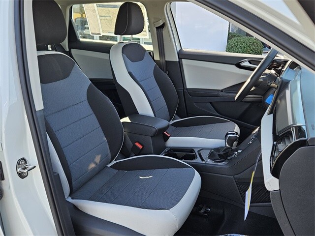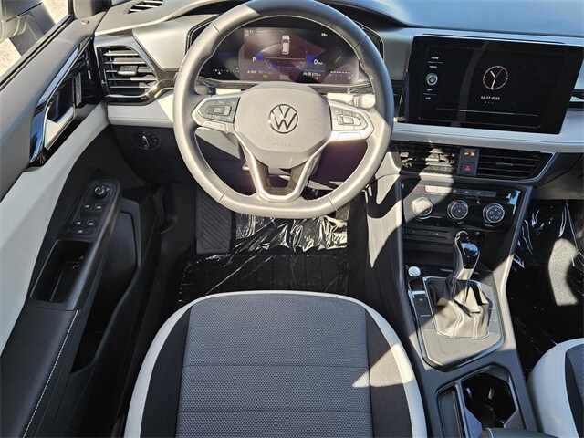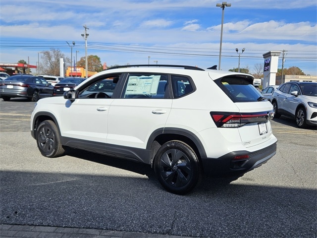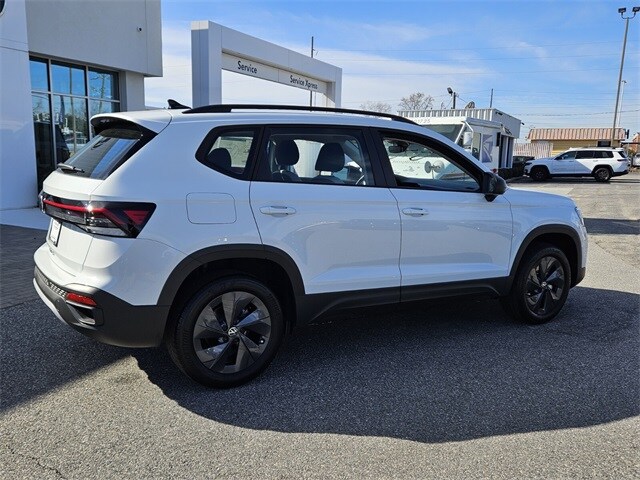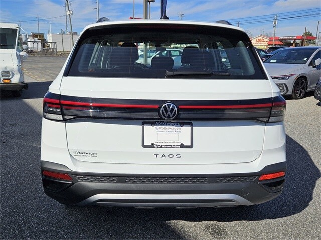 Pure White 2026 Volkswagen Taos 1.5T S FWD 8-Speed Automatic with Tiptronic 1.5L I4 Turbocharged DOHC 16V LEV3-SULEV30 174hp 4-Wheel Disc Brakes, 6 Speakers, ABS brakes, Active Blind Spot Monitor, Air Conditioning, Alloy wheels, AM/FM radio, Auto High-beam Headlights, Brake assist, Bumpers: body-color, Cloth Seating Surfaces, Compass, Delay-off headlights, Driver door bin, Driver vanity mirror, Dual front impact airbags, Dual front side impact airbags, Electronic Stability Control, Emergency communication system: VW Car-Net Safe & Secure 5-year, Exterior Parking Camera Rear, Front anti-roll bar, Front Bucket Seats, Front Center Armrest, Front reading lights, Front Strut Rear Torsion Beam Suspension, Front wheel independent suspension, Fully automatic headlights, Heated steering wheel, Illuminated entry, Leather Shift Knob, Low tire pressure warning, Occupant sensing airbag, Outside temperature display, Overhead airbag, Overhead console, Panic alarm, Passenger door bin, Passenger vanity mirror, Power door mirrors, Power steering, Power windows, Radio data system, Radio: MIB3 Composition Color AM/FM, Rain sensing wipers, Rear anti-roll bar, Rear seat center armrest, Rear window defroster, Rear window wiper, Remote keyless entry, Speed control, Speed-sensing steering, Split folding rear seat, Spoiler, Steering wheel mounted audio controls, Tachometer, Telescoping steering wheel, Tilt steering wheel, Traction control, Trip computer, Variably intermittent wipers, Wheels: 17" Dark Silver Painted Alloy.
