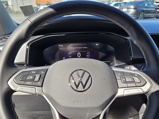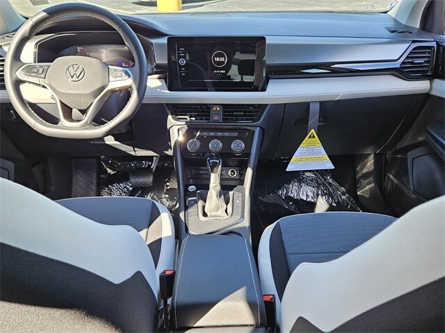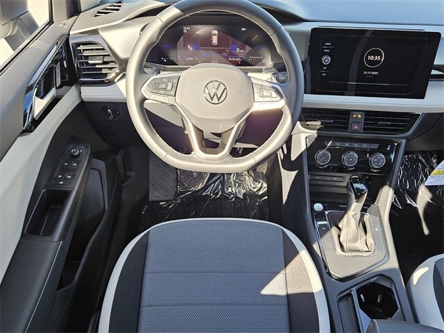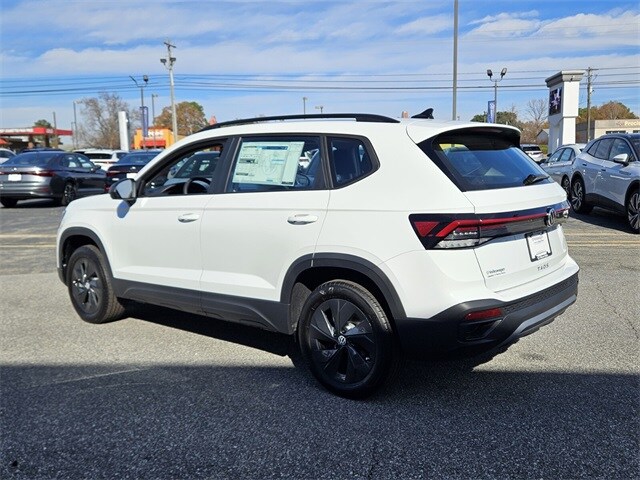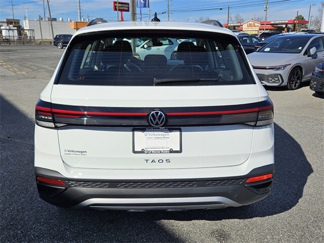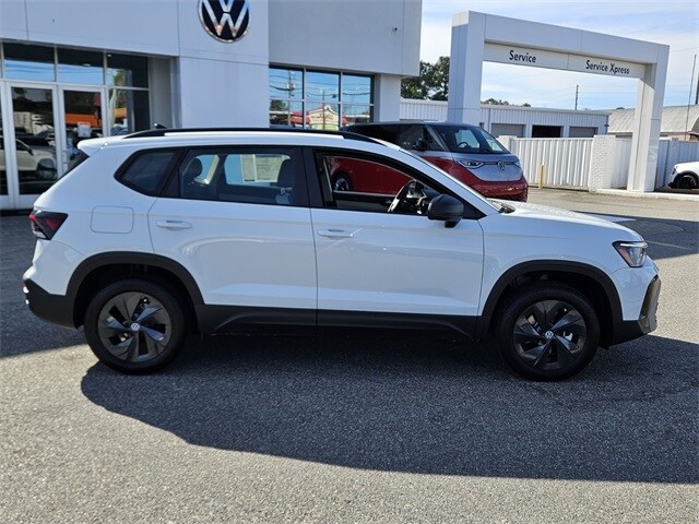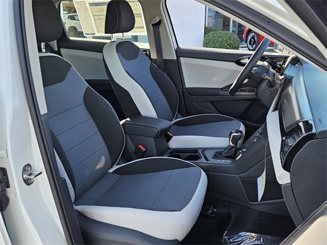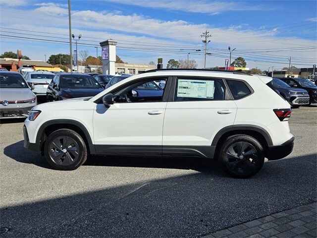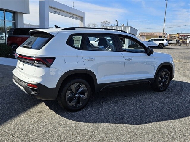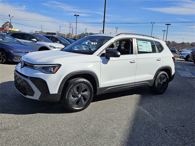 Pure White 2026 Volkswagen Taos 1.5T S FWD 8-Speed Automatic with Tiptronic 1.5L I4 Turbocharged DOHC 16V LEV3-SULEV30 174hp 4-Wheel Disc Brakes, 6 Speakers, ABS brakes, Active Blind Spot Monitor, Air Conditioning, Alloy wheels, AM/FM radio, Auto High-beam Headlights, Brake assist, Bumpers: body-color, Cloth Seating Surfaces, Compass, Delay-off headlights, Driver door bin, Driver vanity mirror, Dual front impact airbags, Dual front side impact airbags, Electronic Stability Control, Emergency communication system: VW Car-Net Safe & Secure 5-year, Exterior Parking Camera Rear, Front anti-roll bar, Front Bucket Seats, Front Center Armrest, Front reading lights, Front Strut Rear Torsion Beam Suspension, Front wheel independent suspension, Fully automatic headlights, Heated steering wheel, Illuminated entry, Leather Shift Knob, Low tire pressure warning, Occupant sensing airbag, Outside temperature display, Overhead airbag, Overhead console, Panic alarm, Passenger door bin, Passenger vanity mirror, Power door mirrors, Power steering, Power windows, Radio data system, Radio: MIB3 Composition Color AM/FM, Rain sensing wipers, Rear anti-roll bar, Rear seat center armrest, Rear window defroster, Rear window wiper, Remote keyless entry, Speed control, Speed-sensing steering, Split folding rear seat, Spoiler, Steering wheel mounted audio controls, Tachometer, Telescoping steering wheel, Tilt steering wheel, Traction control, Trip computer, Variably intermittent wipers, Wheels: 17" Dark Silver Painted Alloy.