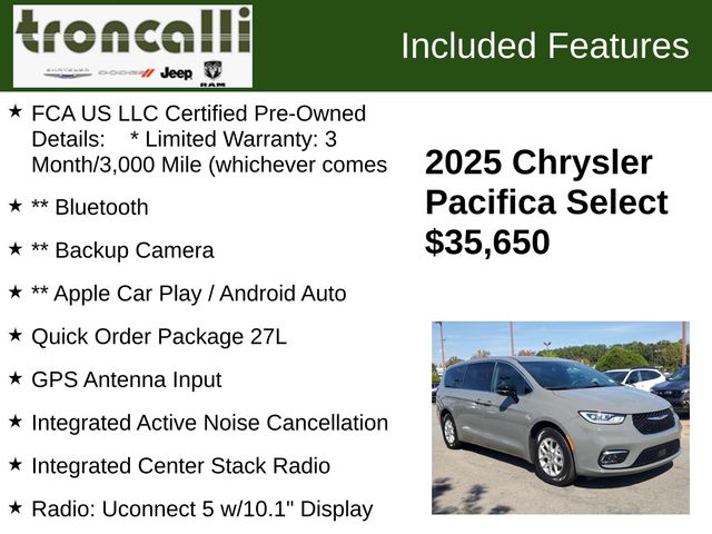 2025 Chrysler Pacifica Select Certified. CARFAX One-Owner. FCA US LLC Certified Pre-Owned Details: * Limited Warranty: 3 Month/3,000 Mile (whichever comes, ** Bluetooth, ** Backup Camera, ** Apple Car Play / Android Auto, 10.1" Touchscreen Display, 17" x 7.0" Aluminum Wheels, 3.25 Axle Ratio, 3rd row seats: split-bench, 4-Wheel Disc Brakes, 4G LTE Wi-Fi Hot Spot, 6 Speakers, ABS brakes, Air Conditioning, Alloy wheels, AM/FM radio: SiriusXM, Apple CarPlay, Apple CarPlay/Android Auto, Auto-dimming Rear-View mirror, Automatic temperature control, Black Seats, Brake assist, Bumpers: body-color, Caprice Leatherette Bucket Seats, Compass, Delay-off headlights, Disassociated Touchscreen Display, Driver door bin, Driver vanity mirror, Driver's Seat Mounted Armrest, Dual front impact airbags, Dual front side impact airbags, Electronic Stability Control, Emergency communication system: Chrysler Connect, For Details, Visit DriveUconnect.com, Four wheel independent suspension, Front Bucket Seats, Front dual zone A/C, Front Fascia Air Deflectors, Front fog lights, Front reading lights, Fully automatic headlights, Garage door transmitter, Google Android Auto, GPS Antenna Input, Heated door mirrors, Heated front seats, Heated steering wheel, Illuminated entry, Integrated Active Noise Cancellation, Integrated Center Stack Radio, Knee airbag, Low tire pressure warning, Memory seat, Occupant sensing airbag, Outside temperature display, Overhead airbag, Overhead console, Panic alarm, ParkView Rear Back-Up Camera, Passenger door bin, Passenger seat mounted armrest, Passenger vanity mirror, Power door mirrors, Power driver seat, Power Liftgate, Power steering, Power windows, Quick Order Package 27L, Radio data system, Radio: Uconnect 5 w/10.1" Display, Rain sensing wipers, Rear air conditioning, Rear reading lights, Rear window defroster, Rear window wiper, Remote keyless entry, Security system, SiriusXM Guardian - Included Trial (B), Split folding rear seat, Spoiler, Steering wheel mounted audio controls, Tachometer, Telescoping steering wheel, Tilt steering wheel, Touring Suspension, Traction control, Trip computer, Turn signal indicator mirrors, USB Host Flip, Variably intermittent wipers, Voltmeter.
