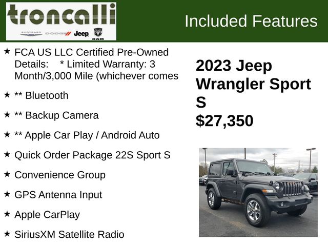 2023 Jeep Wrangler Sport S Certified. CARFAX One-Owner. FCA US LLC Certified Pre-Owned Details: * Limited Warranty: 3 Month/3,000 Mile (whichever comes, ** Bluetooth, ** Backup Camera, ** Apple Car Play / Android Auto, 3.45 Overall Top Gear Ratio, 4-Wheel Disc Brakes, 8 Speakers, ABS brakes, AM/FM radio, Apple CarPlay, Apple CarPlay/Android Auto, Automatic Headlamps, Auxiliary Battery, Black 3-Piece Hard Top, Brake assist, Cloth Low-Back Bucket Seats, Compass, Convenience Group, Deep Tint Sunscreen Windows, Delay-off headlights, Driver door bin, Driver vanity mirror, Dual front impact airbags, Dual front side impact airbags, Electronic Stability Control, Emergency communication system: SiriusXM Guardian, Engine Oil Cooler, Freedom Panel Storage Bag, Front 1-Touch Down Power Windows, Front anti-roll bar, Front Bucket Seats, Front Center Armrest w/Storage, Front fog lights, Front reading lights, Google Android Auto, GPS Antenna Input, Integrated Center Stack Radio, Integrated roll-over protection, Integrated Voice Command w/Bluetooth, Low tire pressure warning, MOPAR All-Weather Floor Mats, No Soft Top, Non-Locking Fuel Cap w/o Discriminator, Normal Duty Suspension, Occupant sensing airbag, Outside temperature display, ParkView Rear Back-Up Camera, Passenger door bin, Passenger vanity mirror, Power Heated Mirrors, Power steering, Premium Wrapped Steering Wheel, Quick Order Package 22S Sport S, Radio data system, Radio: Uconnect 4 w/7" Display, Rear anti-roll bar, Rear reading lights, Rear Window Defroster, Rear Window Wiper/Washer, Remote Keyless Entry, Security Alarm, SiriusXM Satellite Radio, Speed control, Speed Sensitive Power Locks, Sport S, Start-Stop Dual Battery System, Steering wheel mounted audio controls, Sun Visors w/Illuminated Vanity Mirrors, Tachometer, Telescoping steering wheel, Tilt steering wheel, Traction control, Trip computer, Universal Garage Door Opener, USB Host Flip, Variably intermittent wipers, Wheels: 17" x 7.5 Tech Silver Aluminum.