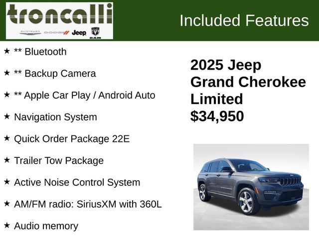 2025 Jeep Grand Cherokee Limited Certified. CARFAX One-Owner. ** Bluetooth, ** Backup Camera, ** Apple Car Play / Android Auto, 220 Amp Alternator, 4-Wheel Disc Brakes, 6 Speakers, ABS brakes, Active Noise Control System, Air Conditioning, Alloy wheels, AM/FM radio: SiriusXM with 360L, Audio memory, Auto High-beam Headlights, Automatic Headlamp Levelling System, Automatic temperature control, Brake assist, Bumpers: body-color, Capri Leatherette Seats, Class IV Receiver Hitch, Compass, Delay-off headlights, Driver door bin, Driver vanity mirror, Dual front impact airbags, Dual front side impact airbags, Dual-Pane Panoramic Sunroof, Electronic Stability Control, Emergency communication system, Four wheel independent suspension, Front Bucket Seats, Front Center Armrest w/Storage, Front dual zone A/C, Front fog lights, Front reading lights, Fully automatic headlights, Garage door transmitter, Heated door mirrors, Heated front seats, Heated rear seats, Heated steering wheel, Heavy-Duty Engine Cooling, Illuminated entry, Knee airbag, Low tire pressure warning, Memory seat, Model Year Tracking, Navigation System, Normal Duty Suspension, Occupant sensing airbag, Outside temperature display, Overhead airbag, Overhead console, Panic alarm, ParkView Rear Back-Up Camera, Passenger door bin, Passenger vanity mirror, Power door mirrors, Power driver seat, Power Liftgate, Power passenger seat, Power steering, Power windows, Quick Order Package 22E, Radio data system, Rear Load Levelling Suspension, Rear reading lights, Rear window defroster, Rear window wiper, Remote keyless entry, Security system, Speed control, Speed-Sensitive Wipers, Split folding rear seat, Spoiler, Steering wheel mounted audio controls, Tachometer, Telescoping steering wheel, Tilt steering wheel, Traction control, Trailer Hitch Zoom, Trailer Tow Package, Trip computer, Turn signal indicator mirrors, Variably intermittent wipers, Voltmeter.