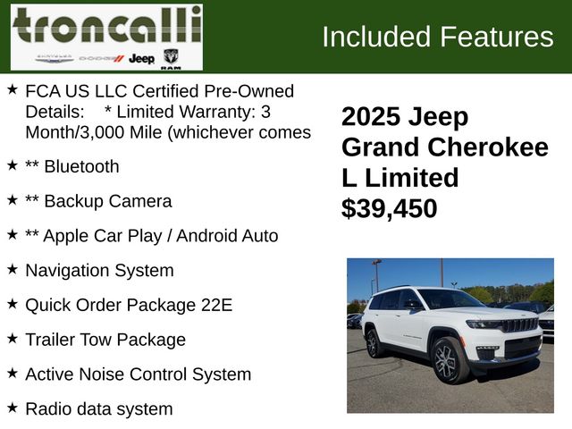 2025 Jeep Grand Cherokee L Limited Certified. CARFAX One-Owner. FCA US LLC Certified Pre-Owned Details: * Limited Warranty: 3 Month/3,000 Mile (whichever comes, ** Bluetooth, ** Backup Camera, ** Apple Car Play / Android Auto, 220 Amp Alternator, 3.45 Rear Axle Ratio, 3rd row seats: split-bench, 4-Wheel Disc Brakes, 6 Speakers, ABS brakes, Active Noise Control System, Air Conditioning, Alloy wheels, AM/FM radio: SiriusXM with 360L, Anti-whiplash front head restraints, Audio memory, Auto High-beam Headlights, Automatic Headlamp Leveling System, Automatic temperature control, Brake assist, Bumpers: body-color, Capri Leatherette Seats, Class IV Receiver Hitch, Compass, Delay-off headlights, Driver door bin, Driver vanity mirror, Dual Exhaust Tips, Dual front impact airbags, Dual front side impact airbags, Dual-Pane Panoramic Sunroof, Electronic Stability Control, Emergency communication system, Four wheel independent suspension, Front Bucket Seats, Front Center Armrest w/Storage, Front dual zone A/C, Front fog lights, Front reading lights, Fully automatic headlights, Garage door transmitter, Heated door mirrors, Heated front seats, Heated rear seats, Heated steering wheel, Heavy-Duty Engine Cooling, Illuminated entry, Interior Rear Facing Camera, Knee airbag, Low tire pressure warning, Manual Fold Seatbacks, Memory seat, Model Year Tracking, Navigation System, Normal Duty Suspension, Occupant sensing airbag, Outside temperature display, Overhead airbag, Overhead console, Panic alarm, ParkView Rear Back-Up Camera, Passenger door bin, Passenger vanity mirror, Power door mirrors, Power driver seat, Power Liftgate, Power passenger seat, Power steering, Power windows, Quick Order Package 22E, Radio data system, Rear air conditioning, Rear Load Leveling Suspension, Rear reading lights, Rear window defroster, Rear window wiper, Reclining 3rd row seat, Remote keyless entry, Security system, Speed control, Speed-Sensitive Wipers, Split folding rear seat, Spoiler, Steering wheel mounted audio controls, Tachometer, Telescoping steering wheel, Tilt steering wheel, Traction control, Trailer Hitch Zoom, Trailer Tow Package, Trip computer, Turn signal indicator mirrors, Variably intermittent wipers, Voltmeter, Wheels: 18" x 8.0" Polished/Painted Aluminum.