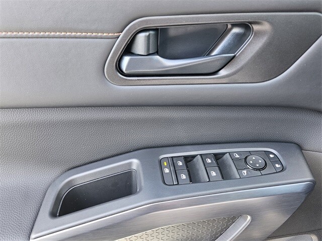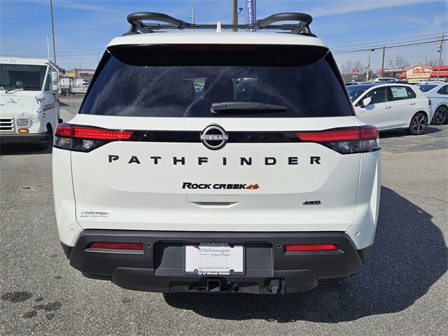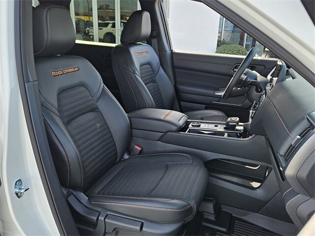 Glacier White 2025 Nissan Pathfinder Rock Creek 4WD 9-Speed Automatic 3.5L V6 DOHC This Pathfinder is equipped with. 4WD, 3rd row seats: bench, 4-Wheel Disc Brakes, 6 Speakers, ABS brakes, Air Conditioning, Alloy wheels, AM/FM radio: SiriusXM, Auto High-beam Headlights, Automatic temperature control, Black Splash Guards (set of 4), Brake assist, Delay-off headlights, Driver door bin, Driver vanity mirror, Dual front impact airbags, Dual front side impact airbags, Electronic Stability Control, Emergency communication system, Four wheel independent suspension, Front anti-roll bar, Front Bucket Seats, Front Center Armrest, Front dual zone A/C, Front fog lights, Front reading lights, Fully automatic headlights, Heated door mirrors, Heated Front Bucket Seats, Heated front seats, Illuminated entry, Knee airbag, Leather steering wheel, Leatherette-Appointed Seating Surfaces, Low tire pressure warning, NissanConnect featuring Apple CarPlay and Android Auto, Occupant sensing airbag, Outside temperature display, Overhead airbag, Overhead console, Panic alarm, Passenger door bin, Passenger vanity mirror, Power door mirrors, Power driver seat, Power Liftgate, Power steering, Power windows, Radio data system, Radio: AM/FM Audio System with NissanConnect, Rear air conditioning, Rear anti-roll bar, Rear Parking Sensors, Rear reading lights, Rear side impact airbag, Rear window defroster, Rear window wiper, Reclining 3rd row seat, Remote keyless entry, Rock Creek All-Season Floor Liners and All-Season Cargo Area Protector, Rock Creek Roof Rack, Roof rack, Security system, Speed control, Speed-sensing steering, Split folding rear seat, Spoiler, Steering wheel mounted audio controls, Tachometer, Telescoping steering wheel, Tilt steering wheel, Traction control, Trip computer, Turn signal indicator mirrors, Variably intermittent wipers, Wheels: 18" x 8J Machined Alloy with Black Finish, 4WD.