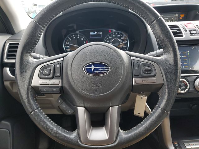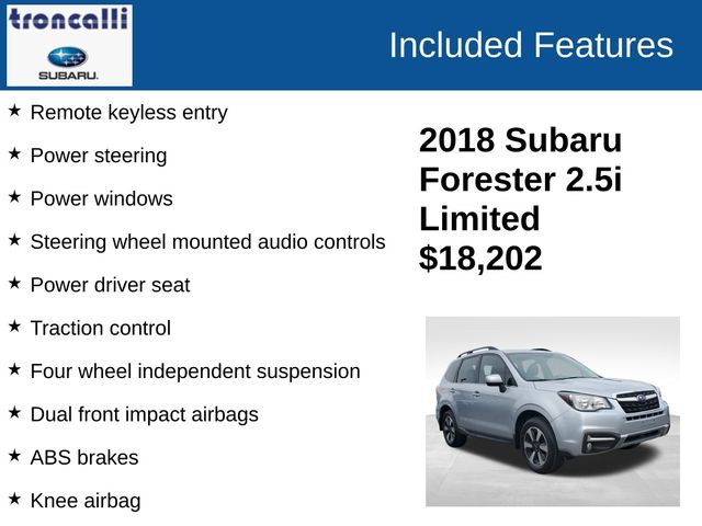 2018 Subaru Forester 2.5i Limited ** Bluetooth, ** Backup Camera, 3.70 Axle Ratio, 4-Wheel Disc Brakes, 6 Speakers, ABS brakes, Air Conditioning, All-Weather Floor Mats, Alloy wheels, AM/FM radio: SiriusXM, Auto-Dimming Exterior Mirror w/Approach Light, Auto-Dimming Mirror w/Compass & HomeLink, Automatic temperature control, Blind Spot Detection, Brake assist, Bumpers: body-color, Driver door bin, Driver vanity mirror, Dual front impact airbags, Dual front side impact airbags, Electronic Stability Control, Emergency communication system: STARLINK, Exterior Parking Camera Rear, Four wheel independent suspension, Front Bucket Seats, Front Center Armrest, Front fog lights, Front reading lights, Fully automatic headlights, Heated door mirrors, Heated Front Bucket Seats, Heated front seats, Illuminated entry, Knee airbag, Leather Shift Knob, Low tire pressure warning, Map & Dome Light LED Upgrade, Occupant sensing airbag, Outside temperature display, Overhead airbag, Overhead console, Panic alarm, Passenger door bin, Passenger vanity mirror, Perforated Leather-Trimmed Upholstery, Popular Package #3B, Power door mirrors, Power driver seat, Power Liftgate, Power moonroof, Power steering, Power windows, Radio data system, Radio: Subaru Starlink 7.0" Multimedia Plus System, Rear Bumper Cover, Rear seat center armrest, Rear Seatback Protector, Rear window defroster, Rear window wiper, Remote keyless entry, Roof rack: rails only, Security system, Speed control, Splash Guards, Split folding rear seat, Spoiler, Steering wheel mounted audio controls, Tachometer, Telescoping steering wheel, Tilt steering wheel, Traction control, Trip computer, Variably intermittent wipers, Wheels: 17" x 7.0J Black Machine Finish Alloy.