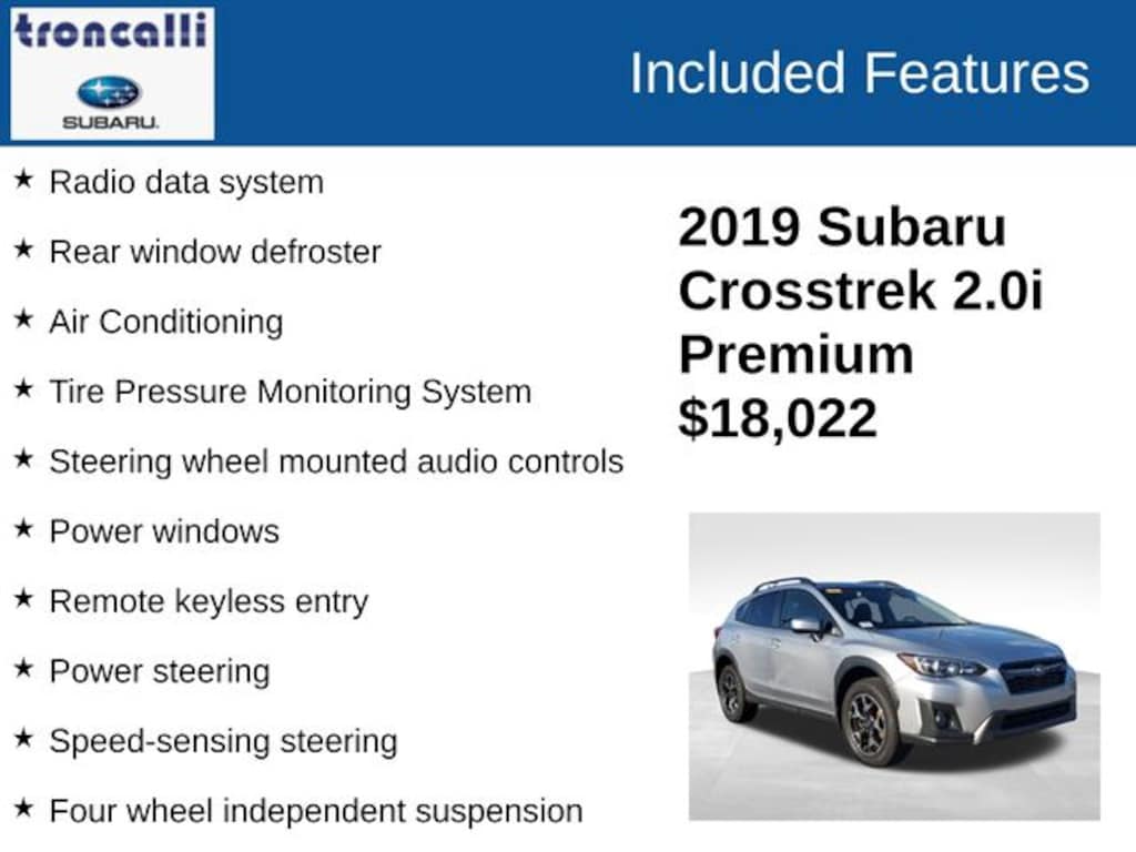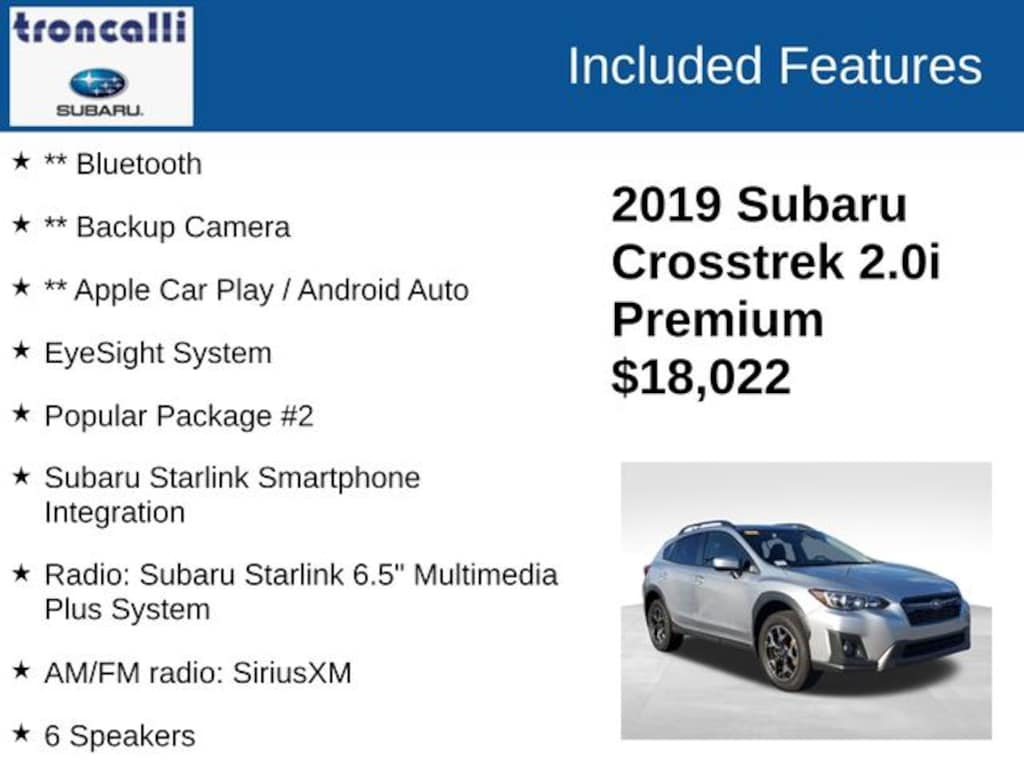 2019 Subaru Crosstrek 2.0i Premium ** Bluetooth, ** Backup Camera, ** Apple Car Play / Android Auto, 17" Alloy Wheels, 3.90 Axle Ratio, 4-Wheel Disc Brakes, 6 Speakers, ABS brakes, Air Conditioning, All-Weather Floor Liners, Alloy wheels, AM/FM radio: SiriusXM, Auto-Dimming Mirror w/Compass & HomeLink, Blind Spot Detection/Rear Cross Traffic Alert, Brake assist, Bumpers: body-color, Cloth Upholstery, Driver door bin, Driver vanity mirror, Dual front impact airbags, Dual front side impact airbags, Electronic Stability Control, Emergency communication system: STARLINK Safety and Security, Exterior Parking Camera Rear, EyeSight System, Four wheel independent suspension, Front Bucket Seats, Front Center Armrest, Front fog lights, Front reading lights, Fully automatic headlights, Heated door mirrors, Heated Front Bucket Seats, Heated front seats, High Grade Instrument Cluster w/Color LCD Display, Illuminated entry, Knee airbag, Leather Shift Knob, Low tire pressure warning, Occupant sensing airbag, Outside temperature display, Overhead airbag, Overhead console, Overhead Console Shower Light, Panic alarm, Passenger door bin, Passenger vanity mirror, Popular Package #2, Power door mirrors, Power steering, Power windows, Radio data system, Radio: Subaru Starlink 6.5" Multimedia Plus System, Rear Bumper Cover, Rear Seat Back Protector, Rear window defroster, Rear window wiper, Remote keyless entry, Roof rack: rails only, Security system, Speed control, Speed-sensing steering, Splash Guards, Split folding rear seat, Spoiler, STARLINK/Apple CarPlay/Android Auto, Steering Responsive Fog Lights, Steering wheel mounted audio controls, Subaru Starlink Smartphone Integration, Tachometer, Telescoping steering wheel, Tilt steering wheel, Tire Pressure Monitoring System, Traction control, Trip computer, Variably intermittent wipers.