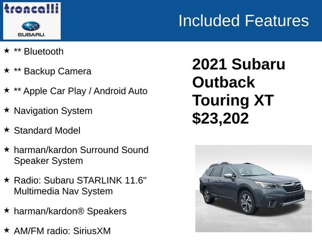 2021 Subaru Outback Touring XT ** Bluetooth, ** Backup Camera, ** Apple Car Play / Android Auto, 12 Speakers, 4-Wheel Disc Brakes, 4.111 Axle Ratio, ABS brakes, Air Conditioning, All-Weather Floor Liners, Alloy wheels, AM/FM radio: SiriusXM, Auto High-beam Headlights, Auto-Dimming Exterior Mirror w/Approach Light, Auto-dimming Rear-View mirror, Automatic temperature control, Brake assist, Bumpers: body-color, Cargo Net, Compass, Dome Light LED Upgrade, Driver door bin, Driver vanity mirror, Dual front impact airbags, Dual front side impact airbags, Electronic Stability Control, Emergency communication system: STARLINK Safety and Security (Subscription Required), Exterior Parking Camera Rear, Four wheel independent suspension, Front anti-roll bar, Front Bucket Seats, Front Center Armrest w/Storage, Front dual zone A/C, Front fog lights, Front reading lights, Fully automatic headlights, Garage door transmitter: HomeLink, harman/kardon Surround Sound Speaker System, harman/kardon® Speakers, Heated & Ventilated Front Bucket Seats, Heated door mirrors, Heated front seats, Heated rear seats, Heated steering wheel, HVAC memory, Illuminated entry, Leather steering wheel, Low tire pressure warning, Magnetite Gray Metallic Body Side Molding, Magnetite Gray Metallic Door Edge Guards, Memory seat, Nappa Leather-Trimmed Upholstery, Navigation System, Occupant sensing airbag, Outside temperature display, Overhead airbag, Overhead console, Panic alarm, Passenger door bin, Passenger vanity mirror, Power door mirrors, Power driver seat, Power Liftgate, Power moonroof, Power passenger seat, Power steering, Power windows, Radio: Subaru STARLINK 11.6" Multimedia Nav System, Rear Bumper Cover, Rear Seat Back Protector, Rear seat center armrest, Rear window defroster, Rear window wiper, Remote CD player, Remote keyless entry, Roof rack, Security system, Speed control, Speed-sensing steering, Splash Guards, Split folding rear seat, Spoiler, Standard Model, STARLINK/Apple CarPlay/Android Auto, Steering wheel mounted audio controls, Steering Wheel Paddle Shift Control Switches, Tachometer, Telescoping steering wheel, Tilt steering wheel, Traction control, Trip computer, Turn signal indicator mirrors, Variably intermittent wipers, Ventilated front seats, Wheels: 18" x 7J Black Aluminum Alloy.