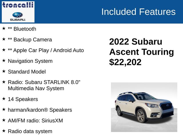 2022 Subaru Ascent Touring CARFAX One-Owner. ** Bluetooth, ** Backup Camera, ** Apple Car Play / Android Auto, 14 Speakers, 3rd row seats: bench, 4-Wheel Disc Brakes, ABS brakes, Air Conditioning, All-Weather Floor Liners, Alloy wheels, AM/FM radio: SiriusXM, Auto High-beam Headlights, Auto-Dimming Exterior Mirror w/Approach Light, Auto-dimming Rear-View mirror, Automatic temperature control, Axle Ratio: 4.44, Brake assist, Bumpers: body-color, Compass, Cup Holder Insert, Delay-off headlights, Driver door bin, Driver vanity mirror, Dual front impact airbags, Dual front side impact airbags, Electronic Stability Control, Emergency communication system: STARLINK Safety and Security (Subscription Required), Exterior Parking Camera Rear, Four wheel independent suspension, Front Bucket Seats, Front Center Armrest, Front dual zone A/C, Front fog lights, Front reading lights, Fully automatic headlights, Garage door transmitter: HomeLink, harman/kardon® Speakers, Heated door mirrors, Heated front seats, Heated rear seats, Heated steering wheel, Illuminated entry, Knee airbag, Low tire pressure warning, Map & Reading Lights LED Upgrade - 6 Bulb Kit, Memory seat, Navigation System, Occupant sensing airbag, Outside temperature display, Overhead airbag, Overhead console, Panic alarm, Passenger door bin, Passenger vanity mirror, Perforated Leather-Trimmed Upholstery, Power door mirrors, Power driver seat, Power Liftgate, Power moonroof, Power passenger seat, Power steering, Power windows, Radio data system, Radio: Subaru STARLINK 8.0" Multimedia Nav System, Rain sensing wipers, Rear air conditioning, Rear Bumper Cover, Rear reading lights, Rear window defroster, Rear window wiper, Reclining 3rd row seat, Remote keyless entry, Security system, Speed control, Split folding rear seat, Spoiler, Standard Model, STARLINK/Apple CarPlay/Android Auto, Steering wheel mounted audio controls, Tachometer, Telescoping steering wheel, Tilt steering wheel, Traction control, Trip computer, Turn signal indicator mirrors, Variably intermittent wipers, Wheels: 20" x 7.5 J Dk Gray Alloy w/Machine Finish.