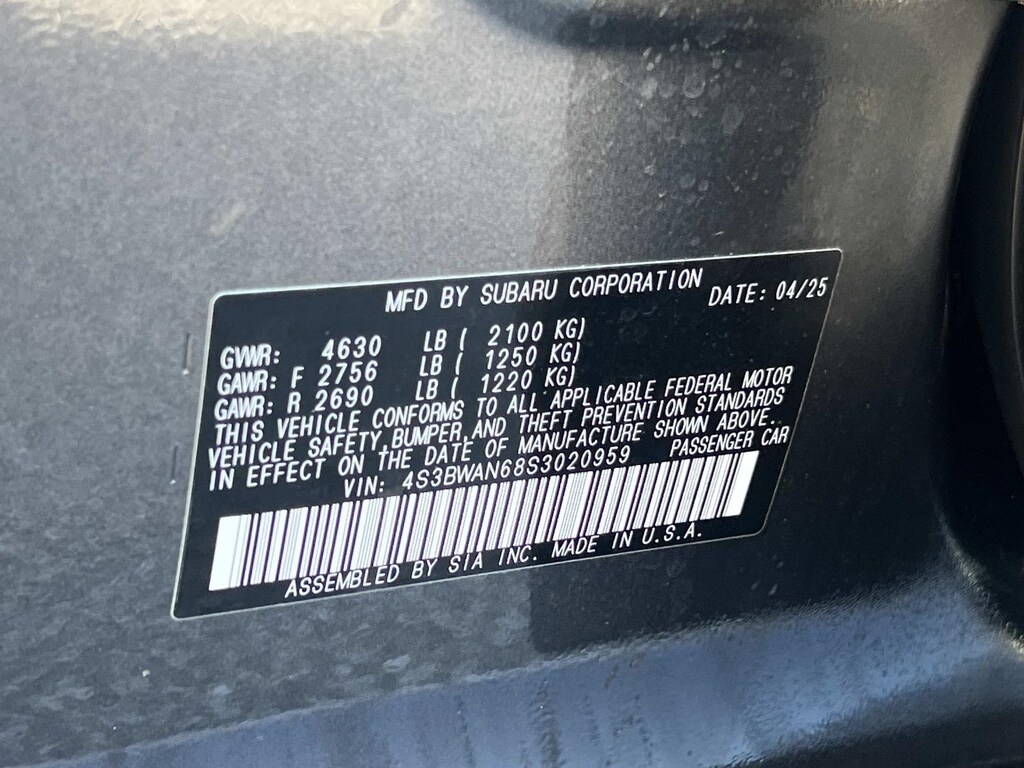 Certified. Gray 2025 Subaru Legacy Limited AWD Lineartronic CVT 2.5L 4-Cylinder DOHC 16V New Feature, **Back up Camera, Legacy Limited, 4D Sedan, 2.5L 4-Cylinder DOHC 16V, Lineartronic CVT, AWD, Gray, Titanium Gray w/Perforated Leather-Trimmed Upholstery, 12 Speakers, 4-Wheel Disc Brakes, ABS brakes, Air Conditioning, All-Weather Floor Liners, Alloy wheels, AM/FM radio: SiriusXM with 360L, Anti-whiplash front head restraints, Auto High-beam Headlights, Auto-dimming Rear-View mirror, Automatic temperature control, Brake assist, Bumpers: body-color, Cargo Tray, Compass, Driver door bin, Driver vanity mirror, Dual front impact airbags, Dual front side impact airbags, Electronic Stability Control, Exterior Auto-Dimming Mirror w/Approach Light, Exterior Parking Camera Rear, Four wheel independent suspension, Front anti-roll bar, Front Bucket Seats, Front Center Armrest w/Storage, Front dual zone A/C, Front fog lights, Front reading lights, Fully automatic headlights, Garage door transmitter: HomeLink, harman/kardon® Speakers, Heated door mirrors, Heated Front Bucket Seats, Heated front seats, Heated rear seats, Heated steering wheel, HVAC memory, Illuminated entry, Knee airbag, Leather steering wheel, Low tire pressure warning, Memory seat, Navigation system: TomTom Navigation w/what3words, Occupant sensing airbag, Outside temperature display, Overhead airbag, Overhead console, Panic alarm, Passenger door bin, Passenger vanity mirror, Perforated Leather-Trimmed Upholstery, Popular Package #3, Power door mirrors, Power driver seat, Power moonroof, Power passenger seat, Power steering, Power windows, Rear anti-roll bar, Rear Bumper Applique, Rear seat center armrest, Rear Seatback Protector, Rear window defroster, Remote keyless entry, Security system, Speed control, Speed-sensing steering, Splash Guards, Split folding rear seat, Steering wheel mounted audio controls, Tachometer, Telescoping steering wheel, Tilt steering wheel, Traction control, Trip computer, Turn signal indicator mirrors, Variably intermittent wipers, Wheels: 18" x 7.5J Gray Mach Finish Aluminum-Alloy.