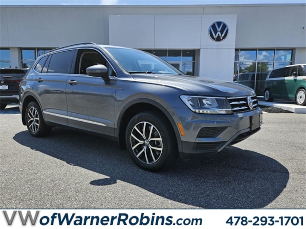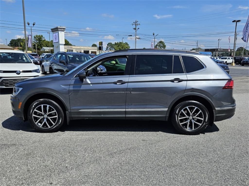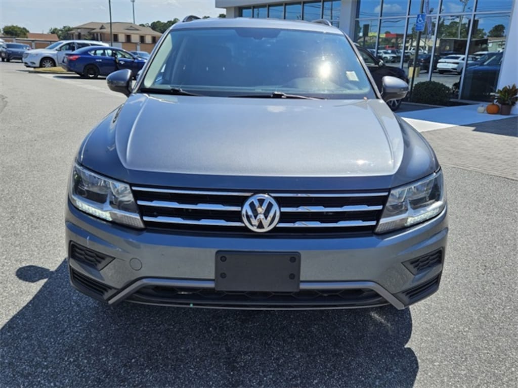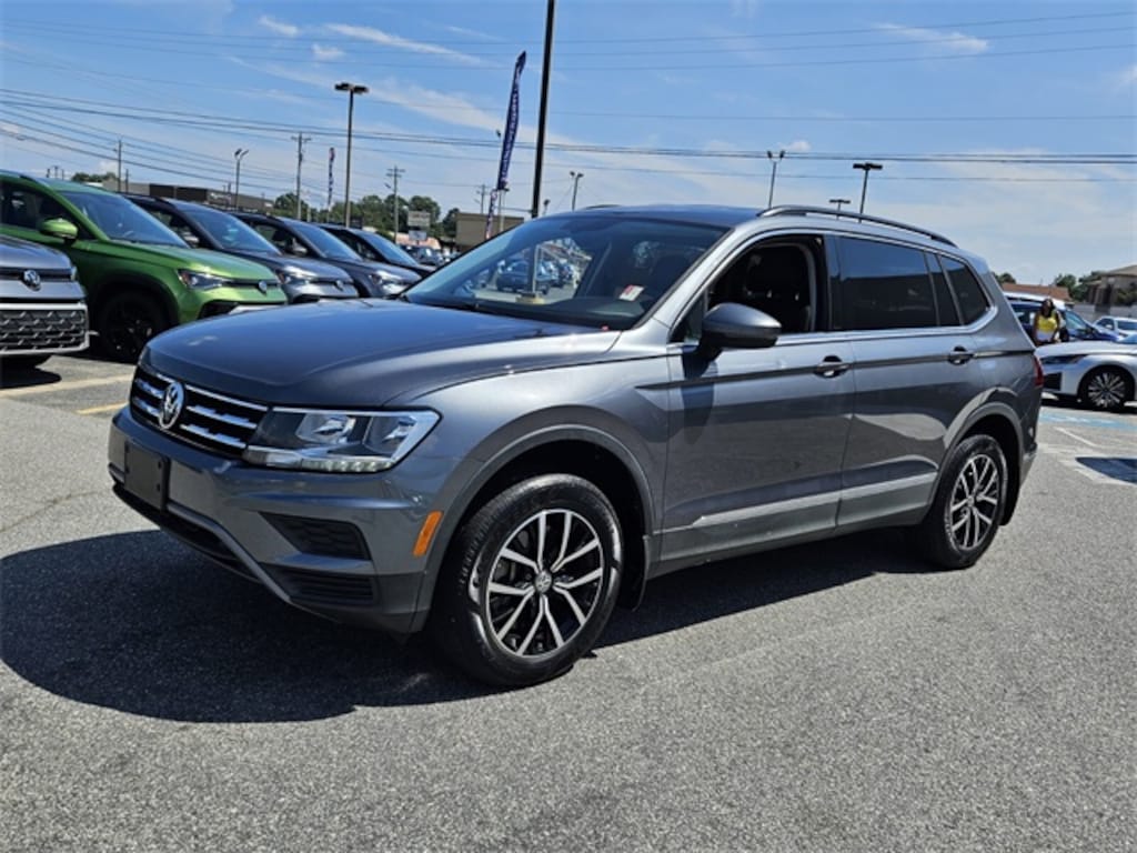 Platinum Gray Metallic 2021 Volkswagen Tiguan 2.0T SE FWD 8-Speed Automatic with Tiptronic 2.0L TSI DOHC This Tiguan is equipped with. 3-Row Rubber Monster Mats w/Logo Kit (Set of 5), 3.33 Axle Ratio, 3rd row seats: bench, 4-Wheel Disc Brakes, 4-Wheel Independent Suspension, 6 Speakers, ABS brakes, Air Conditioning, Alloy wheels, AM/FM radio: SiriusXM with 360L, Automatic temperature control, Brake assist, Bumpers: body-color, Cargo Area Retractable Privacy Cover, Compass, Delay-off headlights, Driver door bin, Driver vanity mirror, Dual front impact airbags, Dual front side impact airbags, Electronic Stability Control, Emergency communication system: VW Car-Net services (capabilities require enrollment or subscription), Exterior Parking Camera Rear, Forward collision: FCW w/Autonomous Emergency Braking mitigation, Four wheel independent suspension, Frameless Auto-Dimming Rearview Mirror, Front anti-roll bar, Front Bucket Seats, Front Center Armrest, Front dual zone A/C, Front reading lights, Fully automatic headlights, Heated door mirrors, Heated Front Comfort Seats, Heated front seats, Heavy Duty Trunk Liner w/VW CarGo Blocks, Illuminated entry, Leather Shift Knob, Low tire pressure warning, Occupant sensing airbag, Outside temperature display, Overhead airbag, Overhead console, Panic alarm, Passenger door bin, Passenger vanity mirror, Perforated V-Tex Leatherette Seating Surfaces, Power door mirrors, Power driver seat, Power steering, Power windows, Radio data system, Radio: MIB3 Composition Media AM/FM/HD, Rear anti-roll bar, Rear reading lights, Rear seat center armrest, Rear window defroster, Rear window wiper, Remote keyless entry, Roof rack: rails only, Security system, Speed control, Speed-sensing steering, Split folding rear seat, Spoiler, Steering wheel mounted audio controls, Tachometer, Telescoping steering wheel, Tilt steering wheel, Traction control, Trip computer, Turn signal indicator mirrors, Variably intermittent wipers, VW Care, Wheels: 17" 2-Tone Machined & Black Alloy.